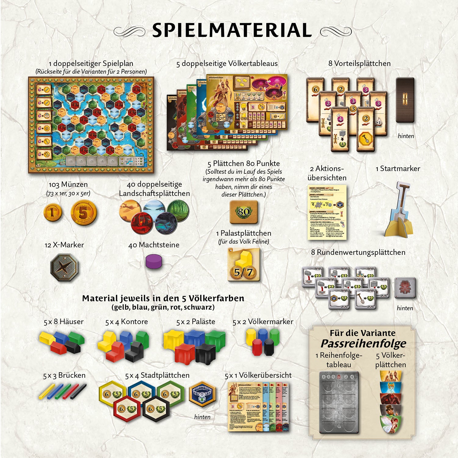Hier entsteht etwas völlig Neues! 10 unterschiedliche Völker stehen in diesem Strategiespiel zur Auswahl. Jedes Volk versucht Runde für Runde, im friedlichen Wettstreit bestimmte Ziele zu erreichen: Gebäude werden errichtet und neue Regionen erkundet. Wem gelingt es, die einzigartigen Fähigkeiten seines Volkes für sich zu nutzen? Wer hat am Ende das größte Gebiet? Besondere Mechanismen wie der Macht-Kreislauf und die Umwandlung der Landschaften machen das Kennerspiel zu einem einzigartigen Abenteuer. Für 2-4 Spielerinnen und Spieler ab 12 Jahren.