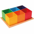Sortierspiel und Aufbewahrung für alle sechsfarbigen Regenbogen Artikel von uns: die Kinder können hier die kleinen Teile von den Regenbogenpilzen (Art. Nr. 10585), die Holzkugeln (10239), die Regenbogen Schnüre (10319), die Holzspulen vom kleinen Fädelspiel (10316) und die Figuren von dem Sortierspiel Regenbogen (42125) einsortieren. Natürlich finden in den Kistchen auch Holzperlen, Stifte oder andere kleine Dinge und Schätze ihren Platz. 6 Teile im Holzrahmen. Holz: Lindenholz farblich lasiert, Rahmen geölt. Maße: L=26cm.