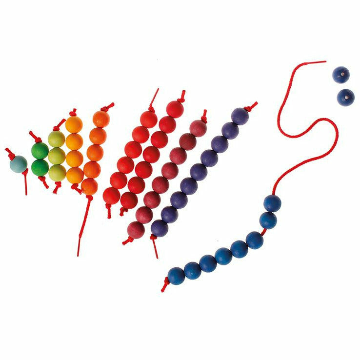 Eine wunderbare Möglichkeit den Kindern im wahrsten Sinne des Wortes die abstrakte Welt der Zahlen begreifbar zu machen. Hier kann wirklich jede Zahl mit den Händen erfühlt und abgezählt werden. Auch das Auge kann über die Länge der entstehenden Perlenschnüre Größenverhältnisse der Zahlen untereinander erfassen. Das Bauset Zahlen (60310/60340), die Figuren zum Zählen und Erzählen (03070), die bunte Perlentreppe (10234), die Stufenzählstäbe (42100), das Steckspiel Zahlen (11061), sowie die 5 Freunde zum Rechnen (10582) sind farblich und inhaltlich perfekt aufeinander abgestimmt und ergänzen sich wunderbar. Den Kindern wird damit spielerisch auf vielfältige Art und Weise die abstrakte Welt der Zahlen anschaulich und begreifbar gemacht. 55 farbige Holzperlen und Baumwollschnur im Baumwollsäckchen zum Auffädeln und Anfertigen von 10 farbigen Zahlen-Perlenschnüren. Holz: Ahorn farblich lasiert. Maße: Perlen Durchmesser 2cm.