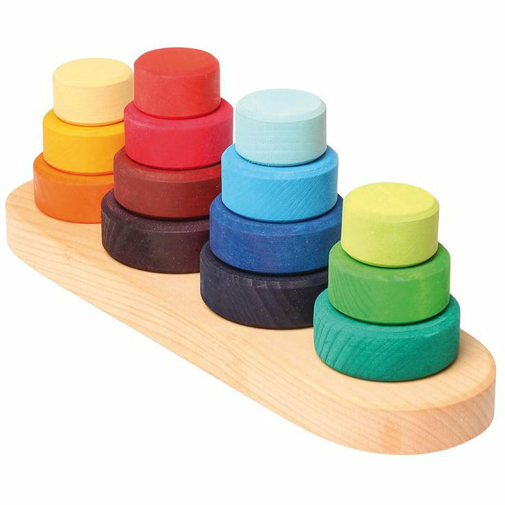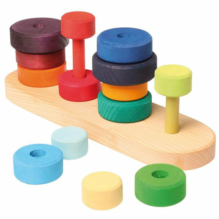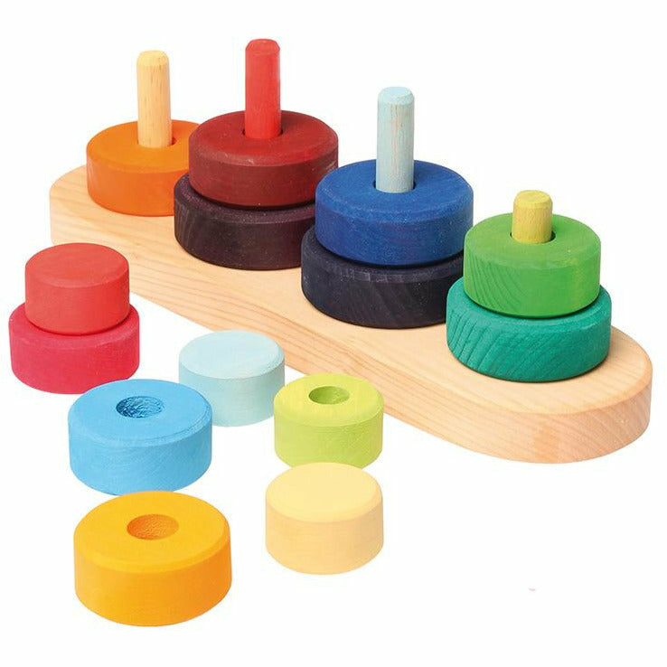 Die unterschiedlichen Farben können hier umsortiert und gesteckt werden. Unterschiedlich hohe Stecktürmchen (3 oder 4 Scheiben hoch) in Gelb-, Rot-, Blau- und Grüntönen. 14 Teile zum Stecken. Holz: Lindenholz farbig lasiert und geölt. Maße: Länge 25cm, Höhe 9,5cm.