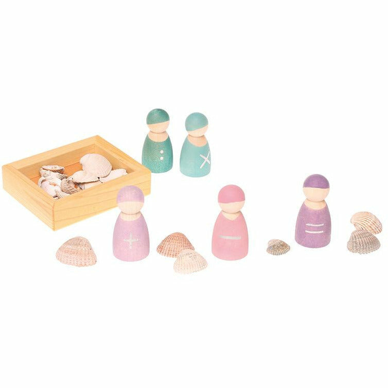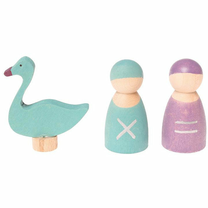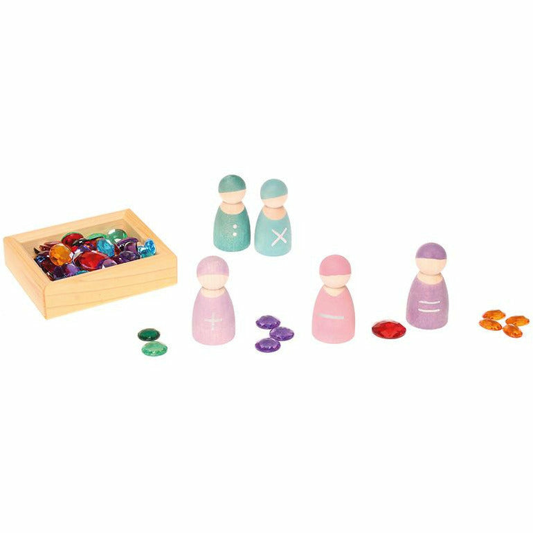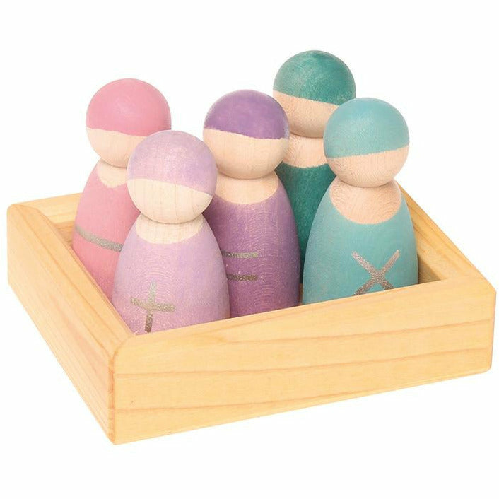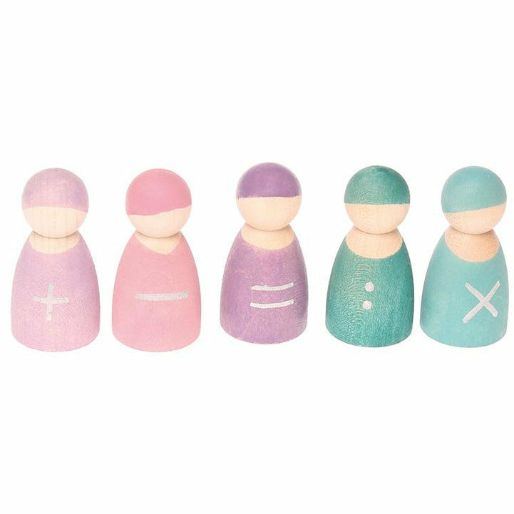 Mit unseren Rechenfreunden können Kinder auf spielerischem Weg die abstrakte Welt der Zahlen entdecken. Wenn Eicheln oder Blüten aus der Natur gesammelt und immer wieder anders zusammengestellt werden, dann entstehen mühelos immer wieder neue Rechenaufgaben. So wird Rechnen mit verschiedenen Sinnen erfahrbar gemacht, wenn die Hände begreifen können, was die Augen sehen. Jeder Rechenfreund ist mit einem Rechenzeichen der 4 Rechenarten (Addition, Subtraktion, Multiplikation und Division) geschmückt. Der fünfte Rechenfreund trägt das Gleichungszeichen und freut sich auf viele Ergebnisse, die auf spielerischem Weg begreifbar gemacht werden. Jedes unserer handbemalten Holzfigürchen ist einzigartig, die individuelle Bemalung gibt jedem Püppchen einen anderen Ausdruck. Diese fröhlichen kleinen Holzmännchen aus verschiedenen und typisch heimischen Hölzern Mitteleuropas sind geschlechtsneutral, können genauso traurig, wie auch fröhlich sein, weil sie keinen festgelegten Gesichtsausdruck haben. 5 handbemalte Holzfiguren im Holzrahmen. Holz: Rechenfreunde mit drei verschiedenen europäischen Holzarten aus nachhaltiger Forstwirtschaft, je nach Verfügbarkeit (Ahornholz, Buchenholz, Kirschenholz oder Erlenholz) farblich lasiert, Rahmen geölt. Maße: Rahmen Länge 10cm, Männchen Höhe 6cm, Durchmesser 3cm.