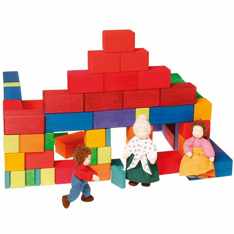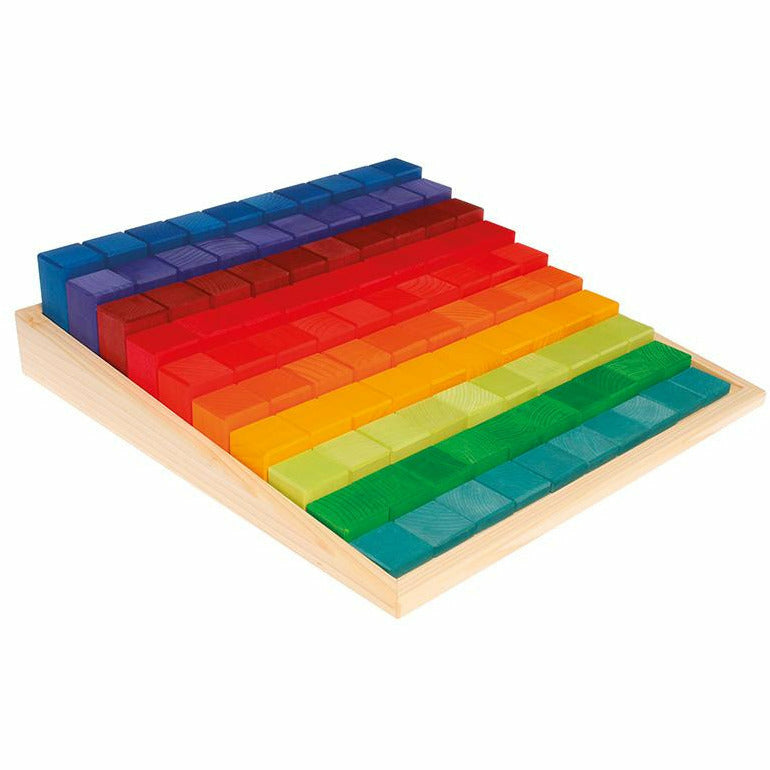 Bauen und Größenverhältnisse erfahren: Den Kindern in jedem Alter werden mit den Stufenzählstäben Größenverhältnisse und räumliches Denken vermittelt. Die Kinder können mit diesen Bauklötzen Bauwerke wie Mauern, Türme und Burgen, Häuschen, Zäune und Ställe bauen. Sie eignen sich aber auch als Rechenhilfe: die Bauklötze sind von 1cm bis 10cm hoch und können so die Zahlenverhältnisse zueinander sichtbar machen. Der Baukasten schmückt jedes Zimmer und lädt immer zum Spielen ein. Beim Bauen und Spielen werden ganz nebenbei die Feinmotorik und das räumliche Denken der Kinder geschult. 100 Bauklötze im Holzrahmen. Holz: Lindenholz farblich lasiert oder geölt. Maße: Länge vom Holzrahmen 44,5cm, einzelne Klötze 4cm Stärke und 1-10cm Höhe.