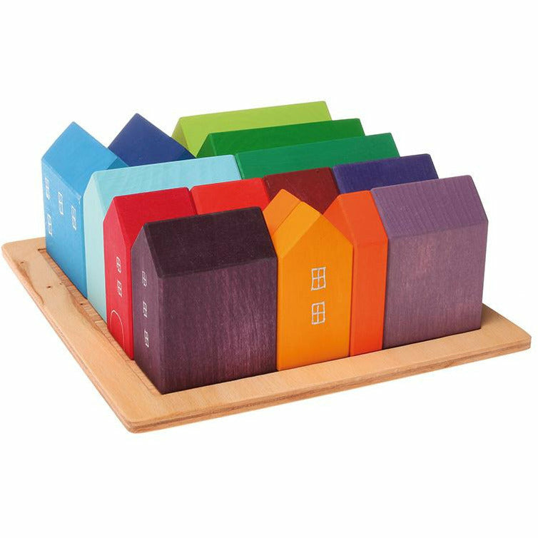 Für kleine Stadtplaner: Schnell entstehen Städte mit moderner Architektur oder Dörfer mit Scheunen und Kirchen, die auch als farbenfrohe Landschaft jede Holzeisenbahn schmücken. Die kleinen Häuser sind durch die einfache Form leicht zu stapeln. Schnell ist ein hoher Turm oder eine kleine Stadt aufgebaut. 15 Häuschen handbemalt mit Türen und Fenstern, auf Holzrahmen. Holz: Lindenholz farblich lasiert, Rahmen Schichtholz geölt. Maße: Rahmenlänge 22cm, Höhe der Häuser ca. 8cm, Breite 2-10cm.