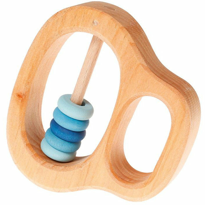 Beißring und Rassel mit fünf kleinen Holzscheibchen in Blautönen. Das verwendete Erlenholz gibt unseren Rasseln und Greiflingen seine besondere und bei jedem Stück einzigartige Struktur. Ein natürliches Pflanzenöl schützt das Holz und bringt seine lebendige Struktur zur vollen Entfaltung. Holz: Erlenholz geölt. Maße: Länge 8cm.