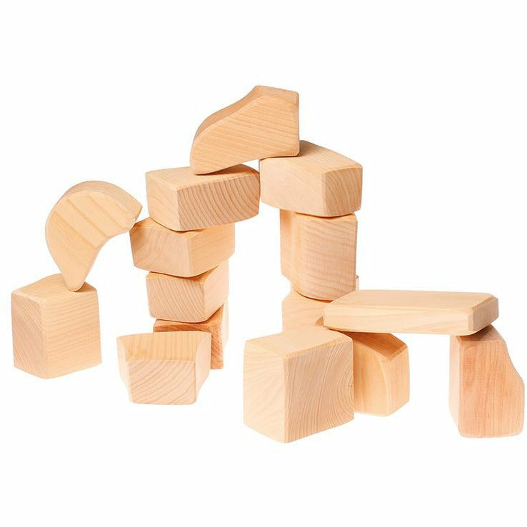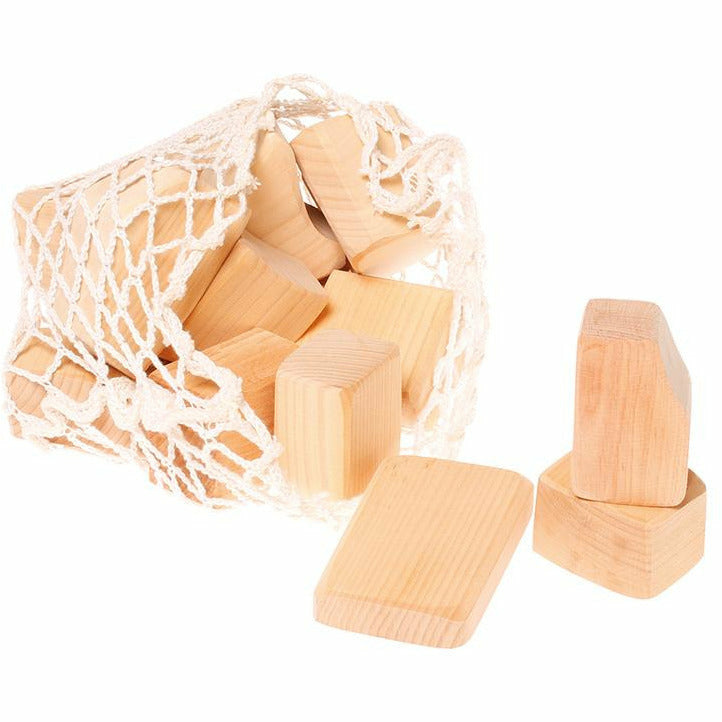 Durch die unregelmäßige Form unserer Bauklötze werden der Fantasie der Kinder keine Grenzen gesetzt und die Kreativität spielerisch gefördert. Ob als Auto, Schiff, Bügeleisen oder um eine Landschaft zu bauen, die Form der Hölzer läßt alles offen. Durch die weiche Oberfläche und ihre Größe gelingen schon den Kleinsten erste Stapelversuche. Und mit dem Baumwoll-Netz ist schnell alles aufgeräumt. Jeder Bauklotz ist einzigartig in seiner Form. Größen und Formen können von Set zu Set variieren. Die Bauklötze werden einzeln von Hand geschliffen und sind daher frei von scharfen Ecken und Kanten. 15 Bauklötze im Netz. Holz: Lindenholz geölt. Maße: ca. 6-8cm.