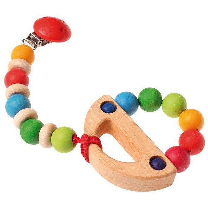 Greifling mit bunten Perlen. Holz: Kugeln aus Buche oder Ahorn, farblich lasiert, Schiff aus Erlenholz geölt. Maße: Durchmesser 9cm, Holzkugeln Durchmesser 2cm.