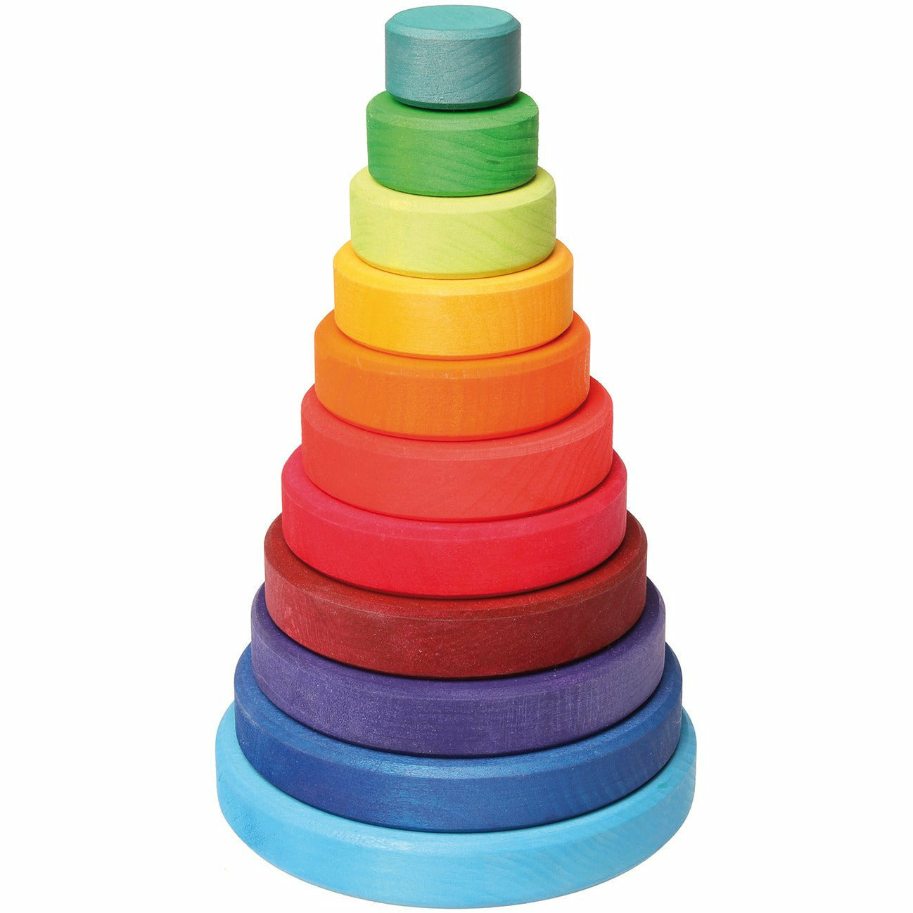 Mit dem großen Scheibenturm können Farben und Größen sortiert, kann gestapelt und gebaut werden. Schult die motorischen Fähigkeiten der Kleinen. 10 Scheiben zum Stecken. Holz: Lindenholz farblich lasiert. Maße: Höhe 21cm.