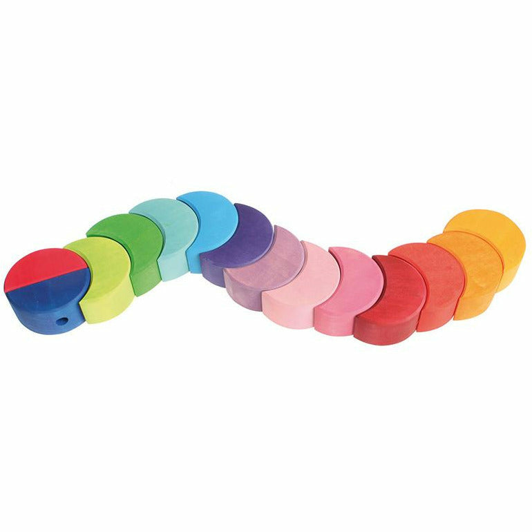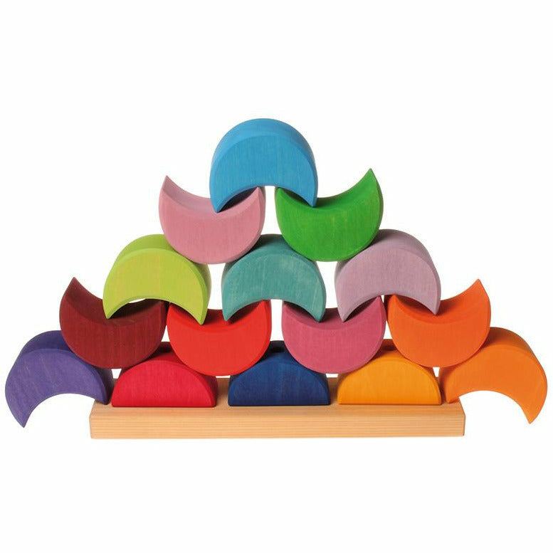 Mit dem Stapelspiel Mondhäuschen lassen sich Farbschlangen legen, schiefe Häuser und Türme bauen und vieles mehr. Die Kinder spielen mit der Balance wenn die Halbmonde schräg aufeinander gestapelt werden. So wird die Motorik der Kleinen geschult. Sogar Bögen kann man mit den Halbmonden bauen durch die rauere Oberfläche innen im Halbmond. 15 Teile. Holz: Lindenholz farblich lasiert, Sockel und Dübel geölt. Maße: Länge 28cm, Höhe 22cm.