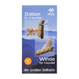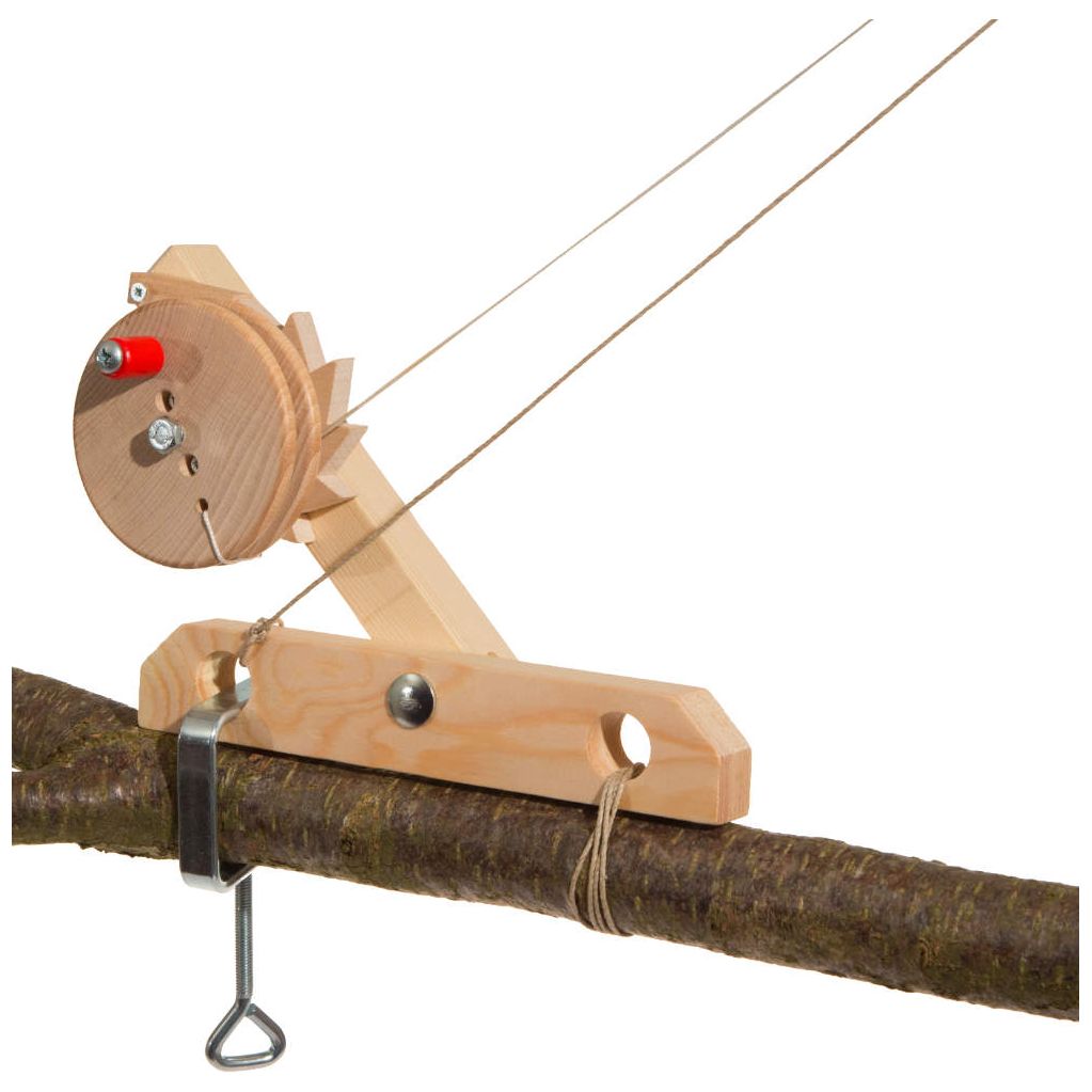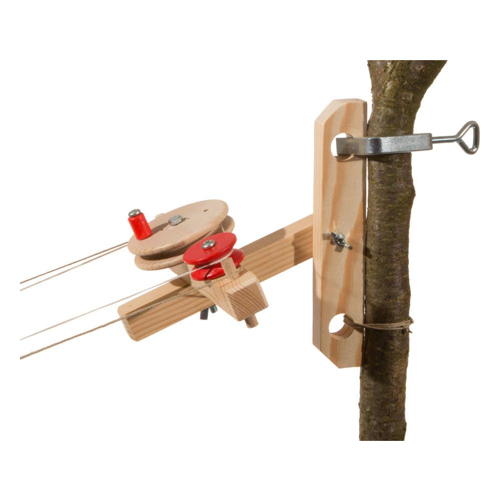 2) Die STATION wird „oben am Berg“ montiert für den Pendelverkehr mit zwei Wagen. Sie hält die beiden Tragseile im richtigen Abstand und lenkt das Zugseil um. Wird an dem Rad gedreht, so kommt die eine Gondel herauf, während die andere abwärts fährt. Man kann auch den oberen Wagen beladen, bis er mit seinem Gewicht die andere Gondel von alleine hochzieht.