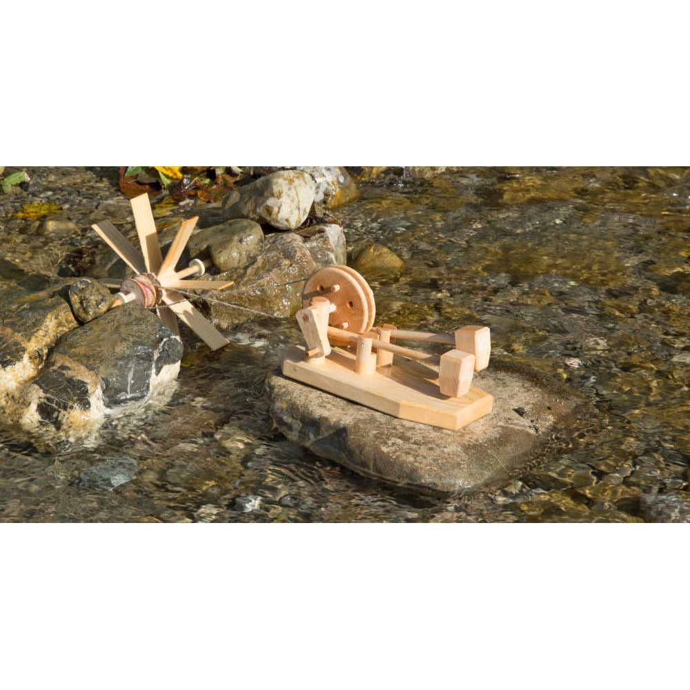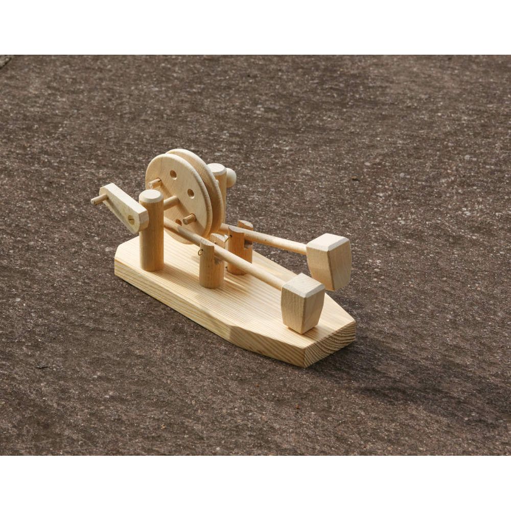 Wie die alten von Wasserkraft getriebenen Schmiedehämmer und Pochwerke klopft und hämmert das HAMMERWERK in verschiedenen Rhythmen. Die Mitnehmerstifte lassen sich verändern, so dass jeder Hammer pro Umdrehung auch mehrmals gehoben werden kann. Verschiedene Materialien als Unterlage ergeben unterschiedliche Klopfgeräusche. Als Antrieb für das Hammerwerk ist ein Wasser- oder Windrad am schönsten.