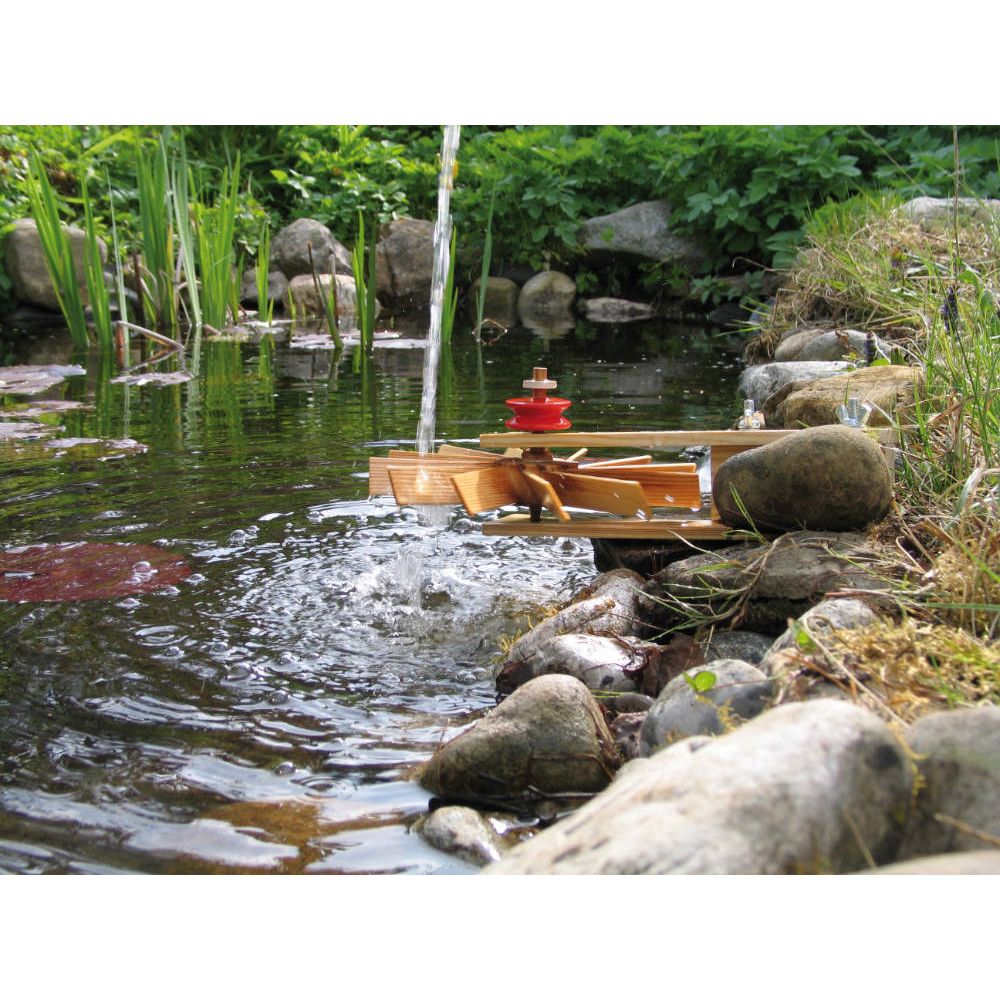 Der Schnelläufer Das Turbinchen zeigt die Funktion einer Wasserturbine: Wasser fällt von oben auf die Schaufeln, überträgt dabei seine Kraft auf das Rad und lässt die senkrechte Achse schnell drehen. Mit einer Schnur können andere Spielzeuge angetrieben werden. Beim Karussell zum Beispiel sollten sich die Püppchen dann gut festhalten.