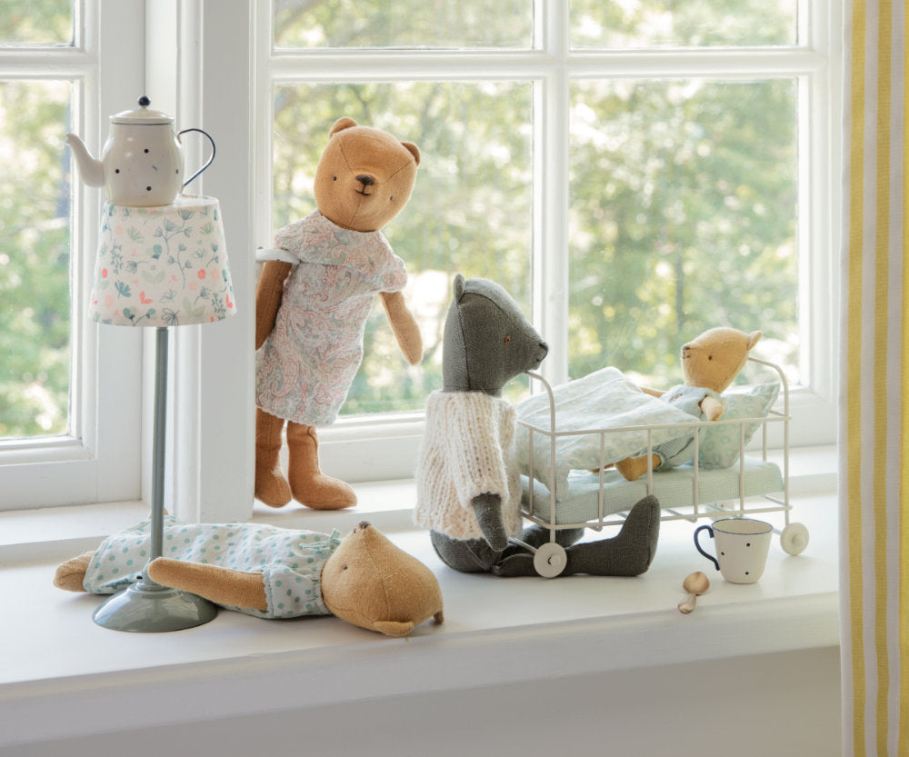 Die schöne Maileg Miniatur-Stehleuchte ist ein Muss. Die Lampe beleuchtet den Raum mit einem sanften Ton - denke daran, das Licht auszuschalten, wenn die Maileg Freunde und Du ins Bett gehen. Die Batterie kann von einem Erwachsenen gewechselt werden.