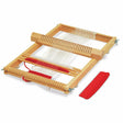 Schulwebrahmen Inesmit angefangener Webarbeit Webbreite 20 cm, Länge: 35 cm Ein praktischer Kleinwebrahmen, auf dem auch längere Teile hergestellt werden können, da Kett- und Warenbaum drehbar sind. Zubehör:2 Schiffchen, Anschlagkamm, Webanleitung mit abgebildetem Webmuster.
