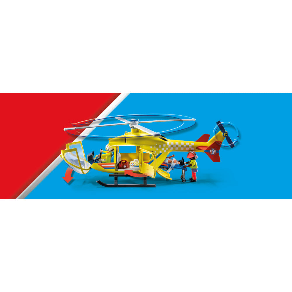 Figuren: 1 Rettungspilot, 1 Rettungscopilotin, 1 Verletzte Zubehör: 1 Rettungshelikopter, 1 Krankentransportliege, 1 Infusion m. Infusionsschlauch, 1 Set Erste Hilfe Instrumente, 1 Rucksack, 1 Verbandstasche, 1 Verbandskoffer, 1 Etikettenbogen mit Verbandmaterial, 1 Helm m. Mikrofon, 1 Schirmmütze, 1 Kopfhörer, 1 Armbanduhr