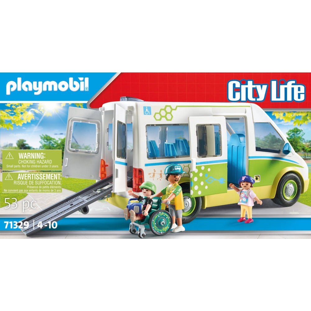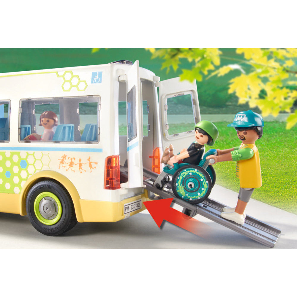 Auf geht's zur Schule! Der Schulbus nimmt alle Kinder mit auf den Weg. Dank der faltbaren Rampe an den Hecktüren kann ein Rollstuhl barrierefrei in den Schulbus geschoben werden. Alle anderen Kinder steigen über die seitliche Schiebetür ein. Das Dach des Schulbusses lässt sich abnehmen, um Kinder und Fahrer ganz leicht auf ihre Plätze setzen zu können. Wenn für besondere Schulausflüge mal mehr Stauraum für Gepäck benötigt wird, hat der Schulbus auch eine Anhängerkupplung.