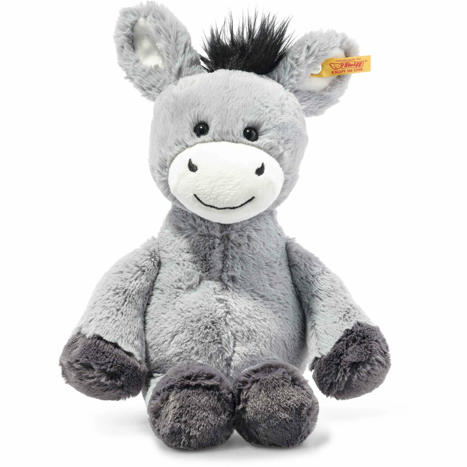 Der 30 cm große Dinkie Esel ist aus kuschelweichem graublauen Plüsch. Die Nase und die Innenohren sind in Weiß abgesetzt. Das niedliche Gesicht zieren aufwendige gestickte Nasenlöcher sowie die lächelnde Mundlinie. Ein schwarzer Haarflaum auf dem Kopf lässt ihn noch entzückender und possierlicher aussehen. Die dunkelgrauen Pfoten sind mit Granulatsäckchen gefüllt. Ein niedlicher Freund für kleine Kinder.