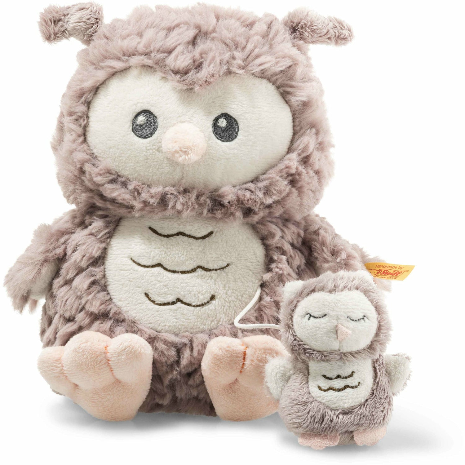 Soft Cuddly Friends Ollie Eule Spieluhr ist aus rosébraunem, babyweichem Plüsch, hat einen cremefarbenen Stoß, einen rosa Schnabel und weiche, rosafarbene Füße. Ihr Gesicht, die Innenflügel und der Bauch sind cremefarben. Den Bauch zieren goldene Bestickungen. Die Spieluhr ist im Bauch der Eule eingearbeitet. Sie ist nicht herausnehmbar. Zieht man an der Schnur mit der kleinen schlafenden Eule, ertönt die Melodie: La Le Lu. Im Gesäß sind Granulatsäckchen für besten Halt eingearbeitet. Eine schöne Geschenkidee zur Geburt.