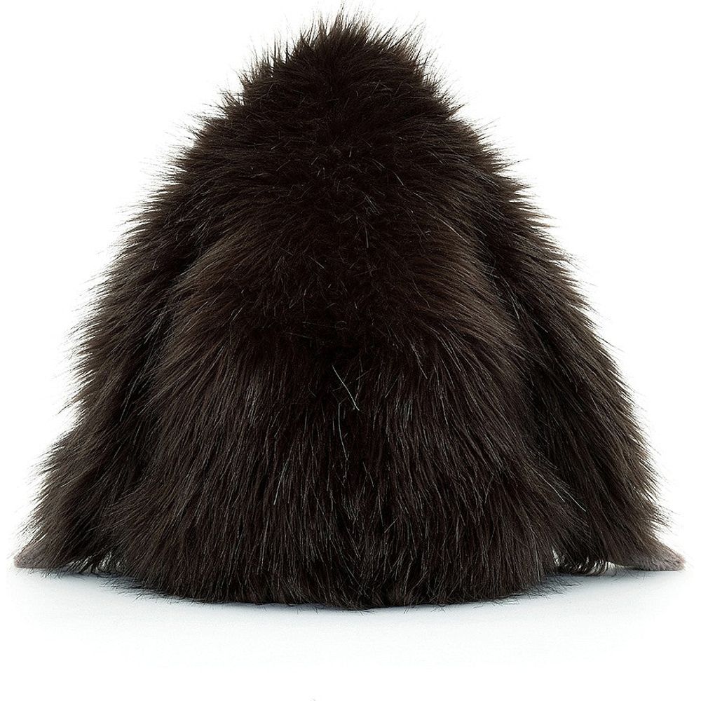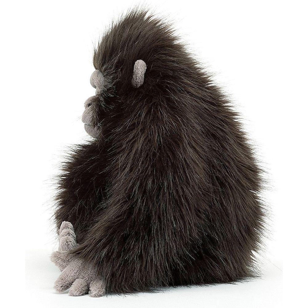 Brauchen Sie schwergewichtige Umarmungen? Gomez Gorilla hat dich. Dieser große Affe hat lange Kuschelarme, bedeckt mit tintenfarbenem, seidigem Fell, mit Händen und Füßen aus grauem Veloursleder, einem paspelierten Mund und einer markant gefurchten Stirn. Mit Gomez kannst du dich jederzeit einkuscheln.