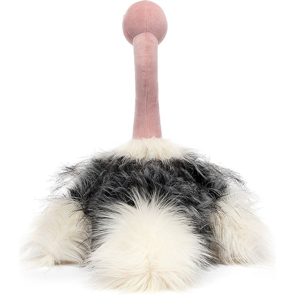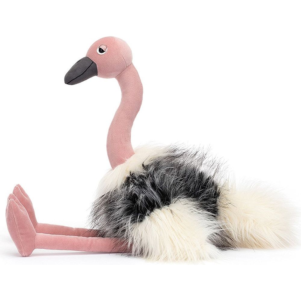 Warum bescheiden sein, wenn man großartig sein kann? Das ist das Motto von Ramonda Ostrich. Dieser elegante Vogel hat einen langen sorbetfarbenen Hals, passende große Füße und riesige, schnelle Beine! Eine Wolke aus wirbelnden schwarzen und cremefarbenen Federn, mit tanzenden Flecken und einem grauen Schnabel aus Wildleder - Ramonda stapft über den Laufsteg!
