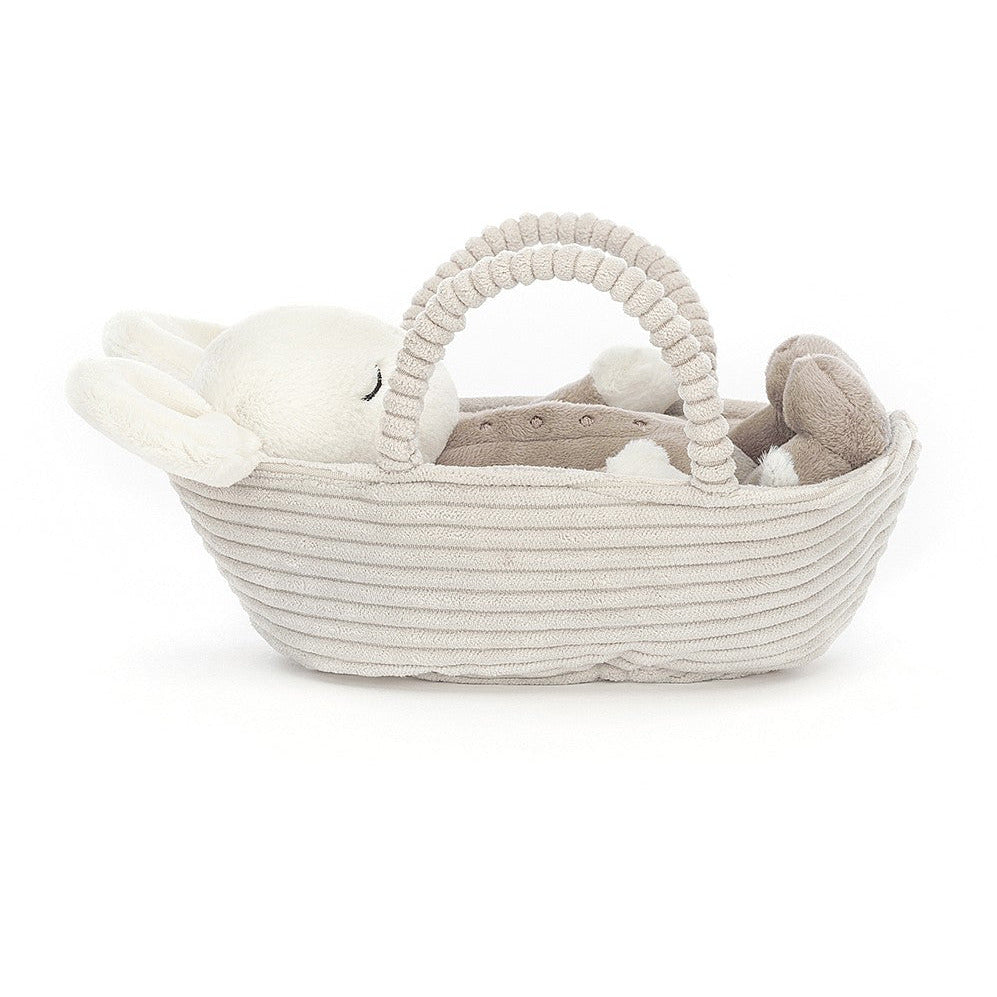 Rock-a-Bye Bunny ist ein friedliches Püppchen, das in einem kuscheligen beigen Körbchen schlummert.