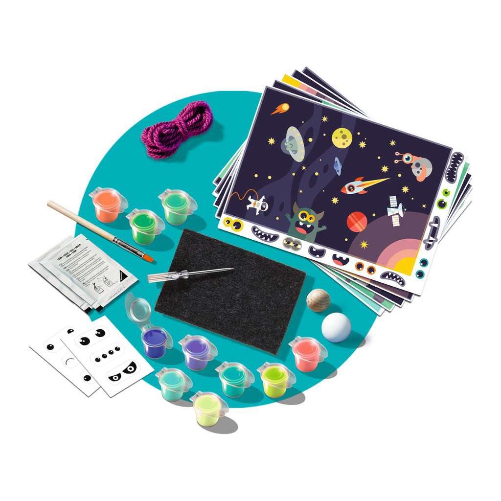 - Inhalt: - Anleitung - Ausschneidebögen - Prickelnadel - Prickelunterlage - Farbnäpfchen - Pinsel - Wolle - Holzkugel - Kunststoffball - Bastelkleber - Stickerbögen