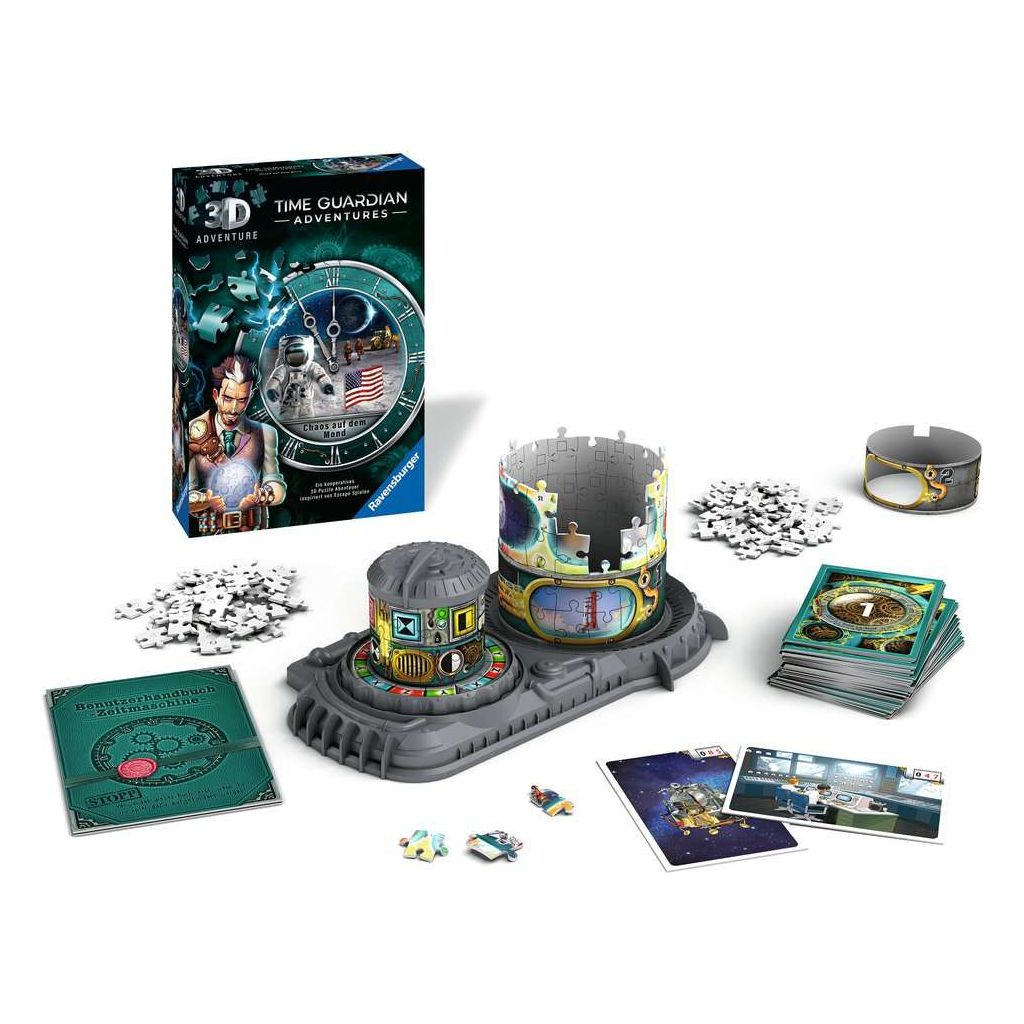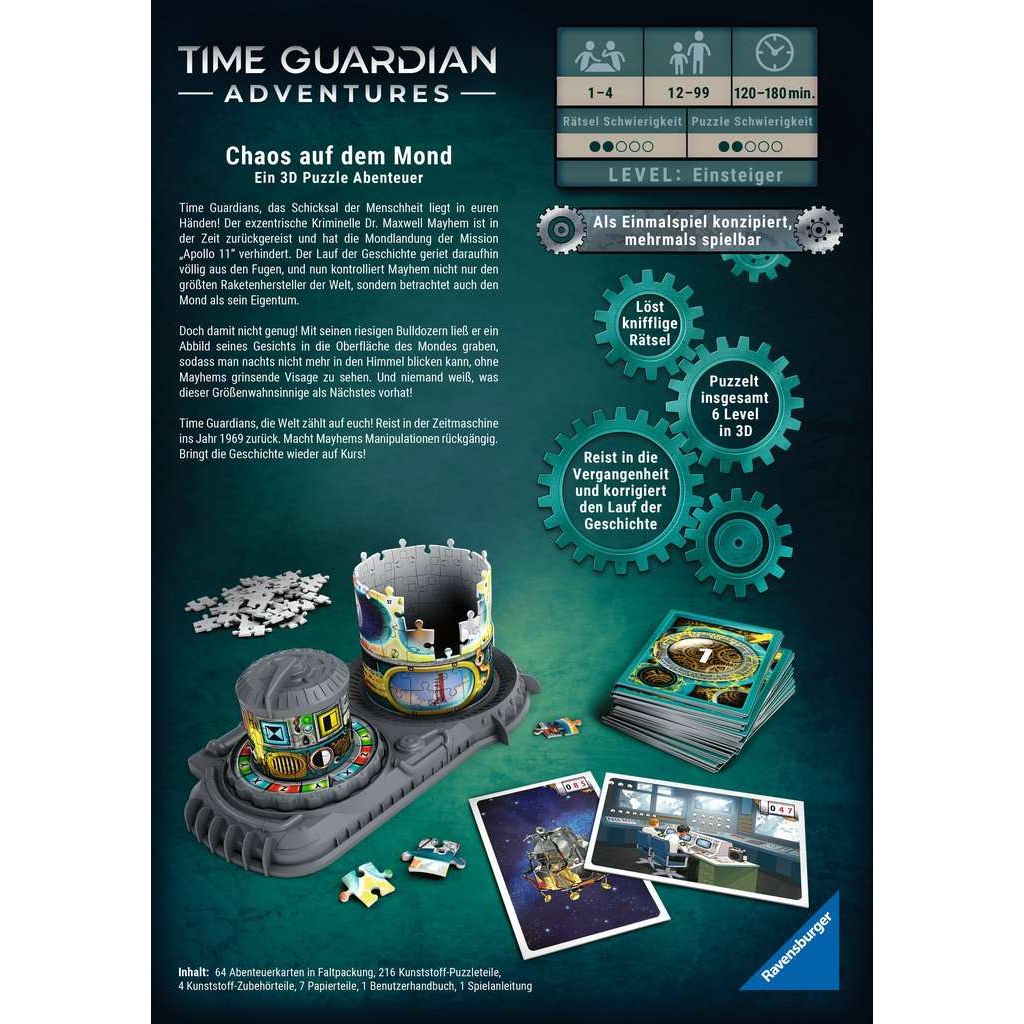 Ravensburger 3D Adventure 11539 TIME GUARDIAN ADVENTURES - Chaos auf dem Mond - Escape Room Spiel, für 1 bis 4 Spieler - Kooperatives 3D Puzzle Abenteuer - einmaliges Event-Spiel ab 12 JahrenProduktbeschreibung: