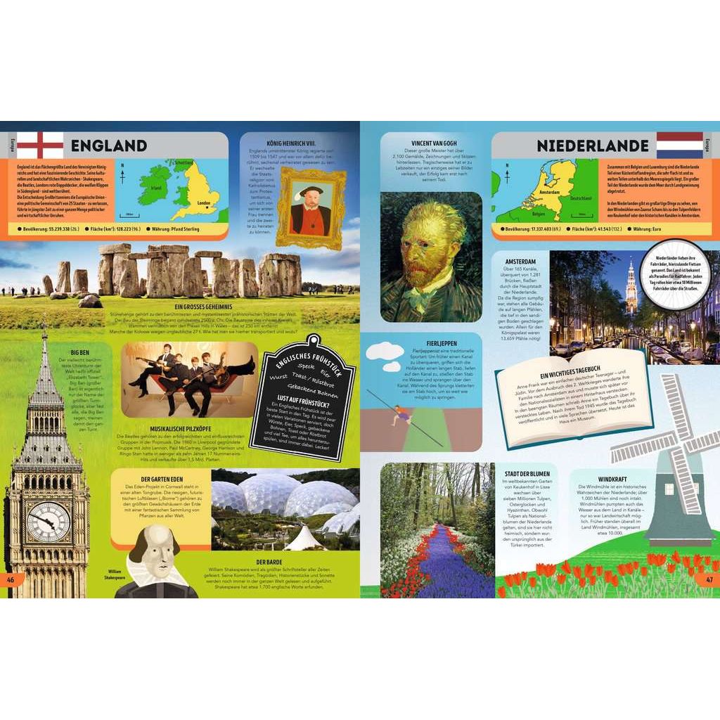 Eine wunderbare Reise um die Welt in Buchform Dieses reich bebilderte Nachschlagewerk führt kleine und große Globetrotter in jedes Land der Welt. Auf dem Programm stehen unter anderem die geheimnisvollen Maya-Stätten, der heilige Wald Nigerias und ein Tauchgang zu den Seekühen vor der Küste Papua-Neuguineas. Neben den wichtigsten Fakten gibt es Spannendes, Faszinierendes und Rekordverdächtiges zu entdecken. Ein tolles Geschenk für Kinder ab 8 Jahren, egal ob zu Ostern, zum Schulbeginn oder zu Weihnachten! Kopfreisen geht immer! Wo jagt der Jaguar? In welchem Land ist Schaukeln Nationalsport? Was ist das Lieblingsgericht der Menschen in Malaysia? "Alle Länder dieser Welt" bietet eine faszinierende Reise rund um den Globus. Egal ob beim Dudelsack dudeln in Schottland, beim Faulenzen mit den Faultieren auf der Schatzinsel Costa Rica oder beim Rikscha fahren in Bangladesch - die Leser erfahren auf ihrem Trip allerlei Wissenswertes, Spannendes und Witziges über all die Länder dieser Erde. Die Themen reichen von Geografie, über kulturelle Eigenheiten und das Leben der Menschen bis hin zu Natur, Pflanzen- und Tierwelt. Faszinierende Fotos und liebevolle Illustrationen machen "Alle Länder dieser Welt" zu einem echten Augenschmaus und bringen die weite Welt direkt ins eigenen Wohn- oder Kinderzimmer. Ein globales Lesevergnügen der besonderen Art, also auf ins Abenteuer!