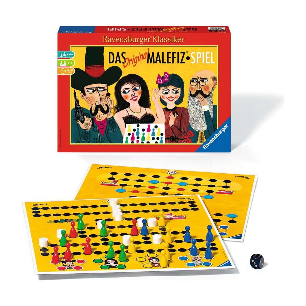 Der Ravensburger Klassiker Malefiz vereint Würfelglück, Taktik und Nervenstärke. Viele Wege führen zum Ziel. Dabei stellt sich die Frage: Ist der eingeschlagene Pfad auf dem Spielplan dann auch der richtige? Was, wenn einen das Würfelglück verlässt und die Mitspieler ein schnelles Weiterkommen versperren? 2-4 Malefiz®-Spieler müssen zügig das Spielgeschehen analysieren und ihre Taktik immer wieder verändern. Nerven aus Drahtseil und ein bisschen Würfelglück können dabei nicht schaden. Das Spiel beinhaltet eine verständliche Spielanleitung für das Original- und das schnelle Malefiz und eignet sich auch ideal als Geschenk. Das Brettspiel beweist, dass nichts so schnell wieder verloren ist wie die Spitzenposition: Wandert das Würfelglück zu den Mitspielern, ist die Poleposition blitzschnell wieder futsch! Und wenn das Schicksal „zuschlägt“, versperrt einem auch noch eine Blockade ein schnelles Aufholmanöver. Andere Blockieren und selbst Steine in den Weg gelegt bekommen, ohne dabei den Spaß am Spiel zu verlieren – eine gute Übung für Jung und Alt gleichermaßen. Das Würfelspiel vereint Einfachheit mit Spannung und Glück, ein Spaß für die ganze Familie von 6 bis 99 Jahre. Den taktisch besten Weg zum Ziel und damit zum Sieg suchen 2–4 Spieler pro Partie.