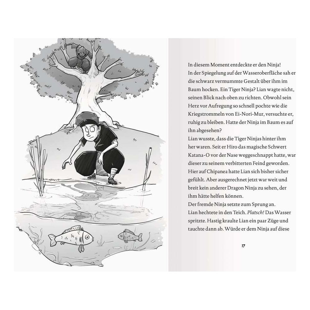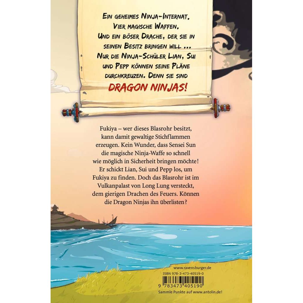 Diese Ninjas sind drachenstark! Die Dragon Ninjas Lian, Sui und Pepp müssen die zweite magische Waffe in ihren Besitz bringen, bevor der böse Drache O-Gonsho sie in seine Klauen bekommt. Denn wer das mächtige Blasrohr Fukiya besitzt, kann damit gewaltige Stichflammen erzeugen. Doch das Blasrohr wird von dem gierigen Drachen des Feuers in seinem Vulkanpalast bewacht. Um ihn zu überlisten, müssen die Freunde erst eine wertvolle seltene Perle finden … Ein geheimes Ninja-Internat. Vier magische Waffen. Und ein böser Drache, der sie in seinen Besitz bringen will ... Nur die Ninja-Schüler Lian, Sui und Pepp können seine Pläne durchkreuzen. Denn sie sind Dragon Ninjas! Entdecke alle Abenteuer der „Dragon Ninjas“-Reihe: Band 1: Der Drache der Berge Band 2: Der Drache des Feuers Band 3: Der Drache des Himmels Band 4: Der Drache der Erde Band 5: Der Drache der Schatten Band 6: Der Drache des Wassers