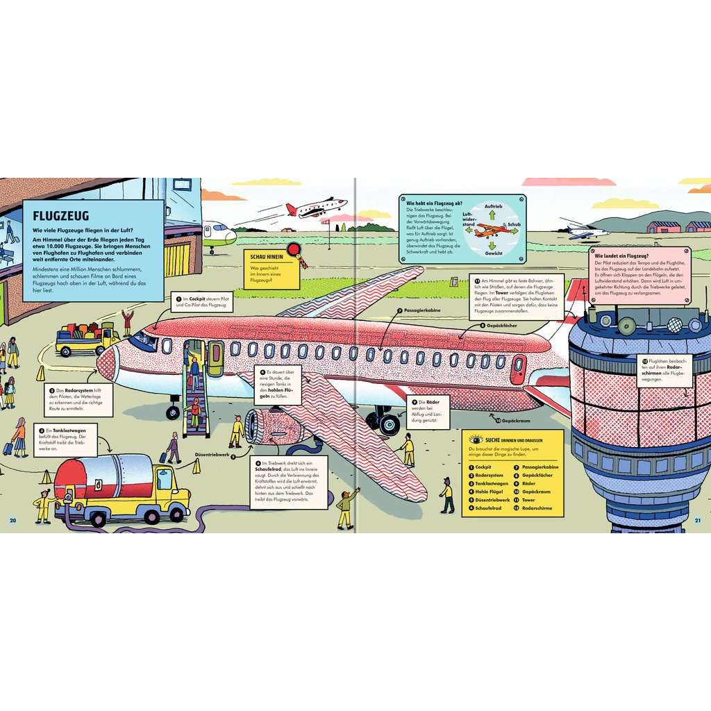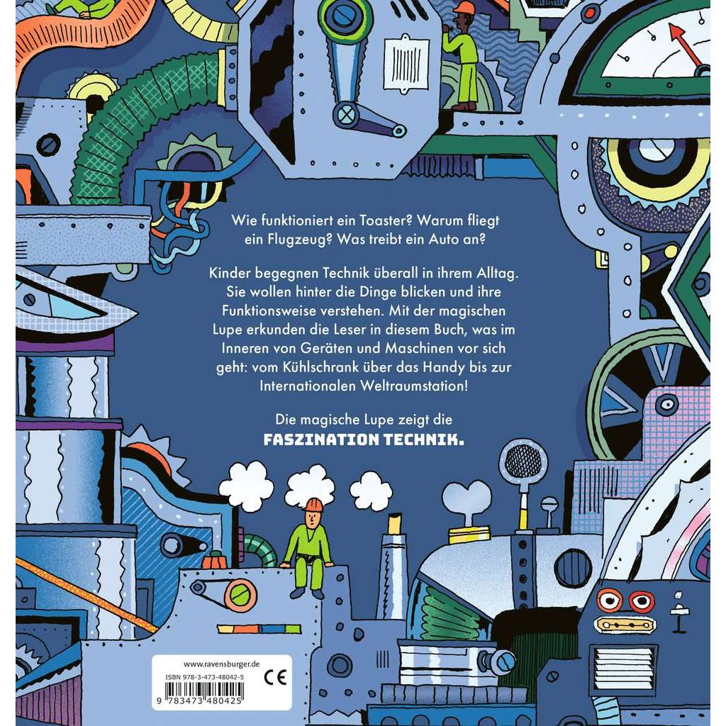 Wie kommt der Strom in die Steckdose? Warum fährt das Auto? Und wie fliegt ein Flugzeug? Die magische Lupe vermittelt technisches Wissen. Kinder sind fasziniert von all der Technik, die sie umgibt. Sie wollen genau wissen, wie die Dinge aufgebaut sind und wie sie funktionieren. Dank der magischen Lupe erkunden die Leser in diesem Buch das Innenleben eines Schiffs, studieren die Funktionsweise der Baustellenfahrzeuge oder blicken durch einen Röntgenapparat in den menschlichen Körper. Kurze verständliche Texte erklären, warum der Kühlschrank kühlt oder wie eine Rakete aufgebaut ist. Suchspiele wecken die natürliche Neugier. Technik begleitet Kinder in ihrem Alltag. Das beginnt schon morgens in der heimischen Küche mit dem Toaster. Auf dem Weg zur Schule kommen sie dann an Baustellen oder am Müllauto vorbei. Im Sommer geht es mit dem Zug oder per Flugzeug in den Urlaub. Fahrzeuge, Apparate und Maschinen faszinieren die Kinder und sie möchten wissen, wie sie funktionieren. Dieses Sachbuch erklärt ihnen, wie Handywellen übertragen werden, was in einem Verbrennungsmotor passiert und warum ein U-Boot tauchen kann. Die magische Lupe ermöglicht es, das Innenleben eines Flugzeugs zu erkunden, die Funktionsweise eines Aufzugs zu studieren oder in den Bauch eines Containerschiffs zu blicken, Selbst komplexe technische Einrichtungen wie die Internationale Raumstation ISS werden in kurzen, altersgerechten Sachtexten erklärt. Spannende Suchaufträge machen dieses Sachbuch zu einem interaktiven Lern- und Spielerlebnis.