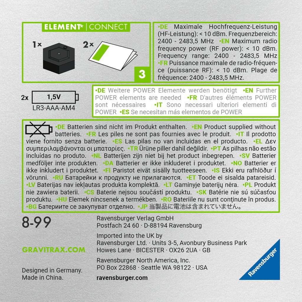 Mit dem GraviTrax Element Connect können alle POWER Bahnen per App steuern, programmieren und weitere spannende Funktionen entdecken. Eine Kugelbahn über ein Smartphone oder Tablet steuern und programmieren? Mit dem GraviTrax POWER Element Connect und der GraviTrax POWER App kein Problem! Coole Funktionen wie Fernsteuerung, Programmierung, Zeitmessung oder auch Sound sorgen für abwechslungsreichen Spielspaß und ermöglichen einen spielerischen Einstieg in die Welt des Programmierens. GraviTrax ist ein flexibel erweiterbares, interaktives Kugelbahnsystem für Kinder ab 8 Jahren: Mit GraviTrax bauen Kinder, Jugendliche und Erwachsene nicht nur einfache Kugelbahnen. Sie erschaffen einzigartige Kugelbahnwelten. Durch das freie Konzipieren der Kugelbahnen und das Erforschen des Rollverhaltens der Kugeln wird das Verständnis für Wissenschaft geschärft und Schwerkraft hautnah erlebbar. Das GraviTrax Universum beinhaltet drei spannende Linien – CORE, PRO und POWER. Alle GraviTrax Linien und Produkte können frei miteinander kombiniert werden. Durch unzählige Erweiterungen mit klassischen Bauelementen oder Steine, die besondere Action und Tricks ermöglichen, lässt sich das GraviTrax-Universum unendlich vergrößern. So kann jeder individuell tüfteln, ausprobieren und über sich hinausbauen.