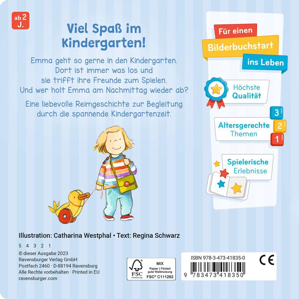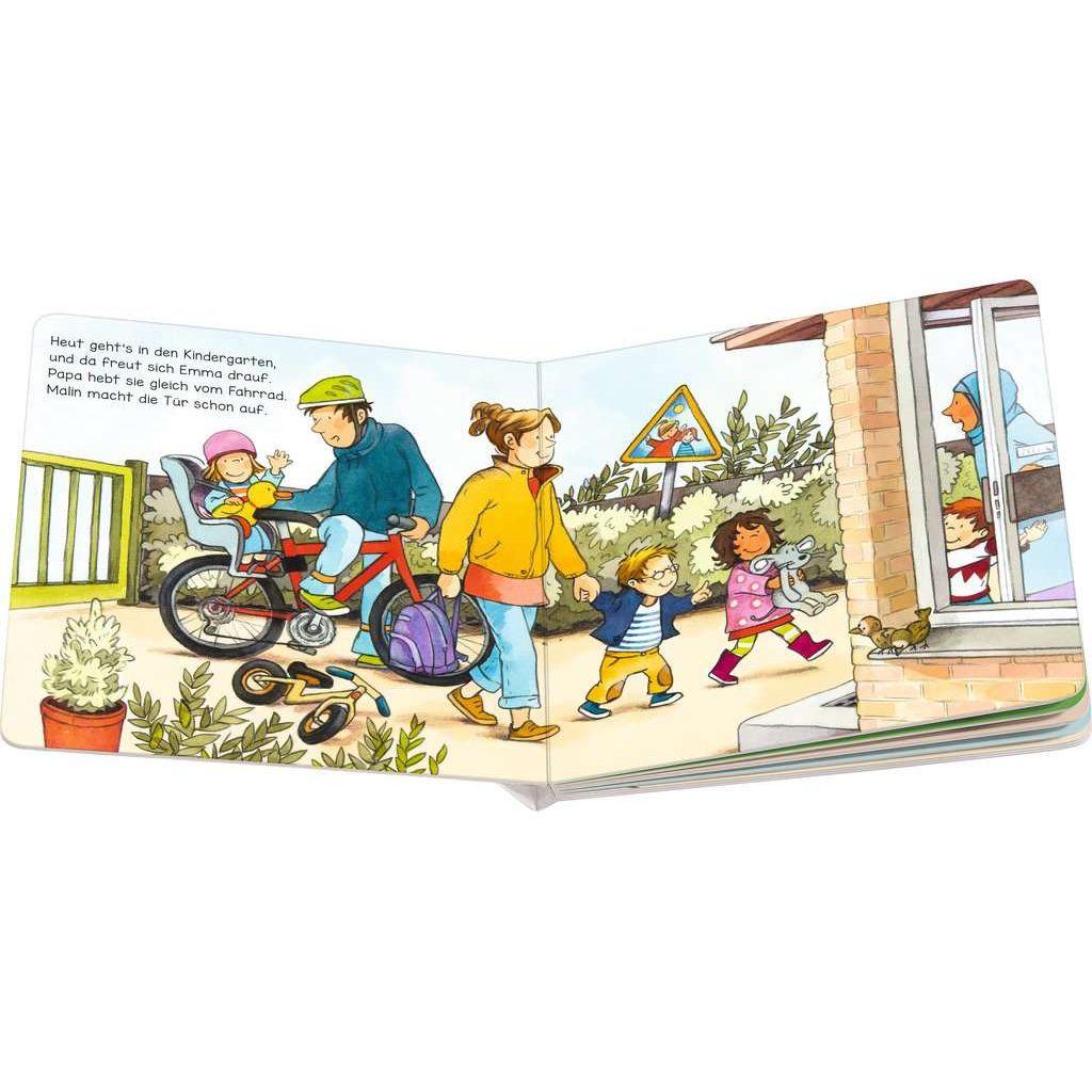 Zur Einstimmung auf die Kita und den Kindergarten Emma geht heute zum ersten Mal in den Kindergarten! Sie ist schon ganz aufgeregt und singt beim Morgenkreis laut mit. Danach spielt sie mit den anderen Kindern und am Nachmittag geht es sogar auf den Spielplatz. Dort backt Emma einen tollen Sandkuchen und hat eine Menge Spaß. Dann holt Mama sie auch schon wieder ab. Emma freut sich schon auf morgen! Die kurze Reimgeschichte ist leicht verständlich und bereitet Kinder ab 2 Jahren einfühlsam und kindgerecht auf den Besuch im Kindergarten vor. Dank der kurzen Reime können auch schon die Kleinsten der Geschichte gut folgen und sich mit Emma und ihren Erlebnissen leicht identifizieren. Die ersten Tage im Kindergarten sind für Eltern und Kinder immer eine kleine Herausforderung. Die meisten Kinder sind voller Vorfreude, aber auch unsicher, weil sie nicht wissen, was sie erwartet oder weil sie noch nie so lange alleine ohne Mama und Papa waren. Die Reimgeschichte bietet tolle Gesprächsanlässe und zeigt den Kleinsten einfühlsam und kindgerecht, wie ein Tag im Kindergarten ablaufen kann. Das nimmt den Kindergartenkindern die Angst und bereitet sie perfekt auf ihren ersten Besuch in der Kita oder dem Kindergarten vor.