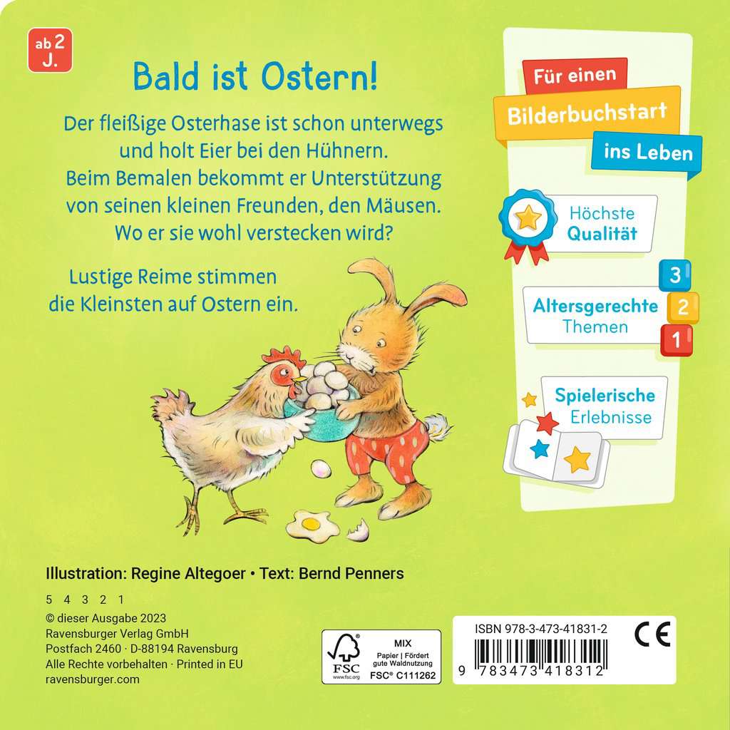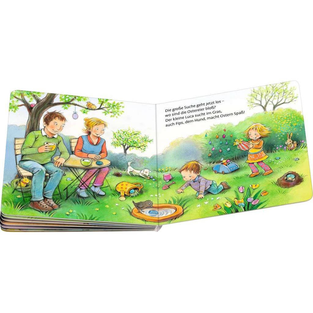 Bald ist Ostern und beim Osterhasen laufen die Vorbereitungen schon auf Hochtouren. Er holt Eier bei den Hühnern, bemalt sie mit seinen Farben und versteckt sie am frühen Ostermorgen in den Gärten. Auch bei den Kindern zuhause werden Ostereier bemalt und Osterlämmer gebacken. Auf 7 Bildern wird gezeigt, wie sich der Osterhase und die Kinder auf das Fest vorbereiten. Der Höhepunkt ist natürlich die große Eiersuche. Kurze Reime laden zum Mitsprechen ein und stimmen die Kleinsten auf Ostern ein. Für kleine Kinder ist das Osterfest das Fest der Überraschungen! Für sie ist alles neu, und ob es den Osterhasen wirklich gibt, eine ganz entscheidende Frage. In diesem lustig illustrieren Pappbilderbuch lernen sie die Osterrituale kennen und können dem Osterhasen bei seiner Arbeit zusehen. Das macht Spaß und lädt Groß und Klein dazu ein, darüber zu sprechen warum Familien das Fest zusammen feiern.
