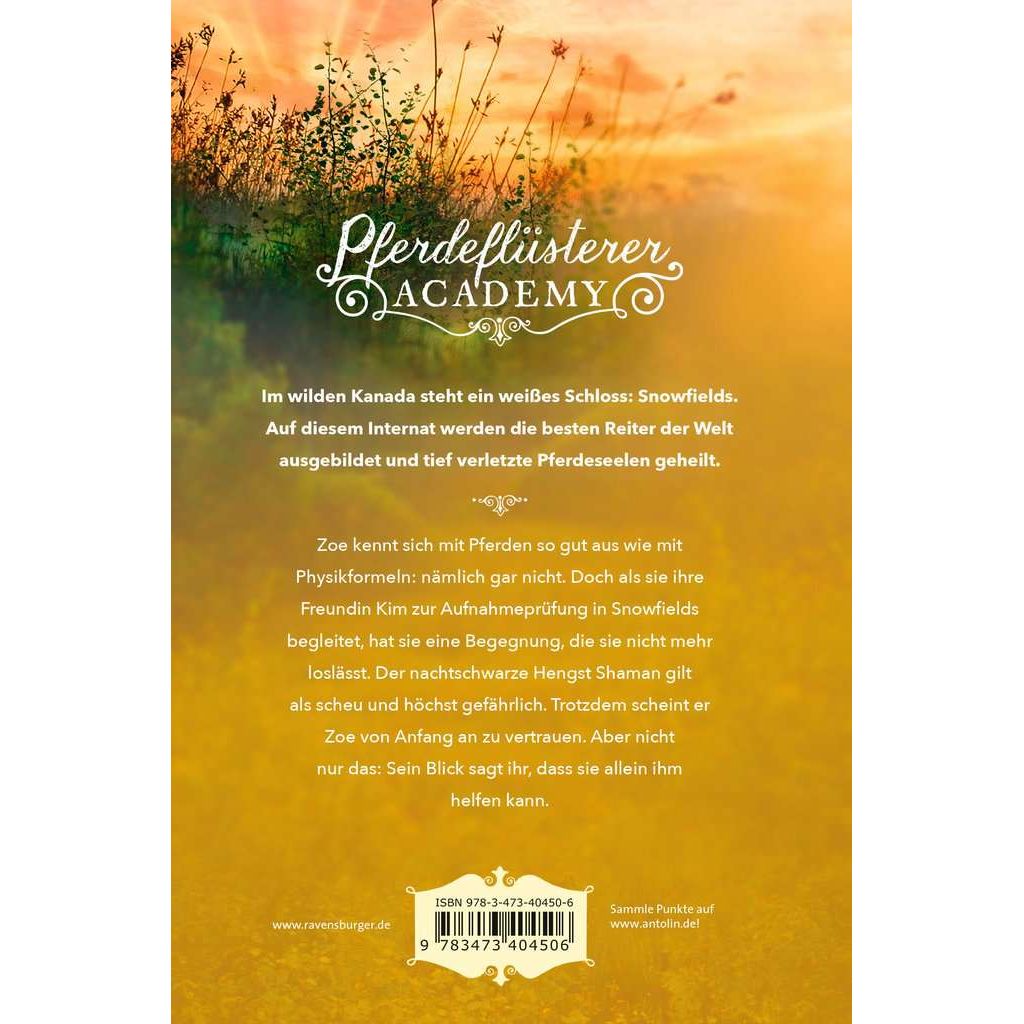 Im wilden Kanada steht ein weißes Schloss: Snowfields. Auf dem Internat werden die weltbesten Reiter ausgebildet und verletzte Pferdeseelen geheilt. Die dreizehnjährige Zoe versteht von Pferden in etwa so viel wie von Physik – nämlich gar nichts. Doch als sie ihre Freundin Kim zur Aufnahmeprüfung ins Reitinternat Snowfields begleitet, hat sie eine Begegnung, die sie nicht mehr loslässt. Der schwarze Hengst Shaman gilt als scheu und gefährlich. Trotzdem scheint er Zoe von Anfang an zu vertrauen. Aber nicht nur das: Sein Blick sagt ihr, dass sie allein ihm helfen kann. Entdecke alle Abenteuer in der „Pferdeflüsterer-Academy“: Band 1: Reise nach Snowfields Band 2: Ein geheimes Versprechen Band 3: Eine gefährliche Schönheit Band 4: Verletztes Vertrauen Band 5: Zerbrechliche Träume Band 6: Calypsos Fohlen Band 7: Flammendes Herz Band 8: Zoes größter Sieg Band 9: Cyprians Rückkehr Band 10: Die dunkle Wahrheit Band 11: Verborgene Gefühle Band 12: Wild und verwundbar Band 13: Taminos Entführung