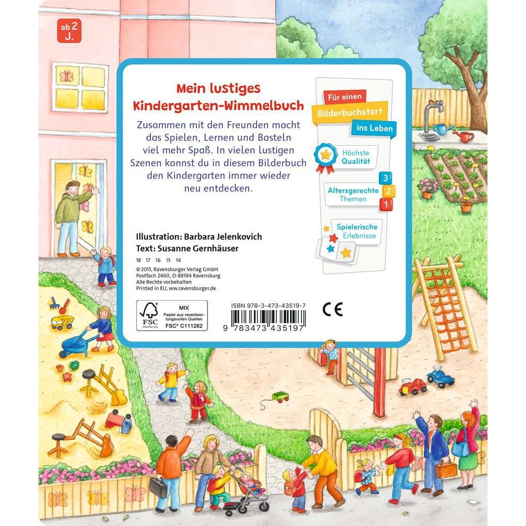 Willkommen im Kindergarten! Auf elf farbenfrohen, realitätsnahen Illustrationen werden alle Fragen zum Thema Kindergarten beantwortet. Ob drinnen oder draußen: hier macht das Spielen mit den kleinen Freunden Spaß. Es gibt eine Kinderküche, einen Waschraum, einen Turnraum und natürlich Spiel- und Kuschelecken. Die kurzen Texte beinhalten auf jeder Seite einen leichten Suchauftrag, der dazu motiviert die kleinen Bilder in den großen Schauseiten zu suchen und zu benennen. Das schult die Konzentrationsfähigkeit und fördert den Spracherwerb. Schon in der Garderobe wird klar: In diesem Kindergarten kommen alle Kinder gerne an. Die kleinen Freunde werden begrüßt und helfen sich gegenseitig. Es geht weiter in die Gemeinschaftsräume zum Spielen, Basteln, Singen und Turnen. Natürlich gibt es auch eine Kuschel- und Vorleseecke. Und der Waschraum hat extra kleine Waschbecken und niedrige Kindertoiletten. Da macht das Händewaschen Spaß! Auf einer weiteren Seite wird Geburtstag gefeiert, zusammen musiziert und auch geturnt. Natürlich gehen die Kinder zusammen nach draußen: Im Garten kann getobt, gebuddelt und geklettert werden.Ein umfangreiches Themenbuch, ideal als Einstiegshilfe in den Kindergartenalltag.Einfache Texte mit kleinen Suchaufträgen regen dazu an, die Bildervignetten auf der rechten Seite im großen Bild zu suchen und wiederzuentdecken.
