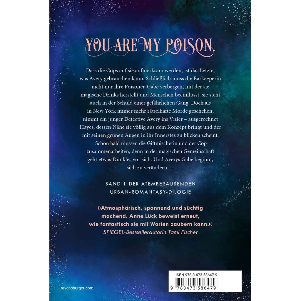 You are my poison. Dass die Cops auf sie aufmerksam werden, ist das Letzte, was Avery gebrauchen kann. Schließlich muss die Barkeeperin nicht nur ihre Poisoner-Gabe verbergen, mit der sie magische Drinks herstellt und Menschen beeinflusst, sie steht auch in der Schuld einer gefährlichen Gang. Doch als in New York immer mehr rätselhafte Morde geschehen, nimmt ein junger Detective Avery ins Visier – ausgerechnet Hayes, dessen Nähe sie völlig aus dem Konzept bringt und der mit seinen grünen Augen in ihr Innerstes zu blicken scheint. Schon bald müssen die Giftmischerin und der Cop zusammenarbeiten, denn in der magischen Gemeinschaft geht etwas Dunkles vor sich. Und Averys Gabe beginnt, sich zu verändern … Knisternd. Gefährlich. Packend. Band 1 der atemberaubenden SPIEGEL-Bestseller-Dilogie *** Leseprobe *** „Avery.“ Dieses Wort nur. Nur mein Name. Und plötzlich war es, als würde die Umgebung um mich herum wieder leiser werden. Ruhiger. Schärfer. Ich blickte auf, in dem Moment, in dem sich Hayes vor mich hinhockte. Er stützte die Ellenbogen auf den Knien ab, die Hände ineinander verschränkt, und sah mich mit einem ernsten Blick an, der tausend Worte sagte und doch kein einziges. Mein Blick zuckte zu seiner Brust, wo links das Logo des NYPD prangte. Er war im Dienst. Um Himmels willen, natürlich war er das. Er war zu einem Verbrechen gerufen worden. Und ich, eine Magierin, war seine Hauptverdächtige.