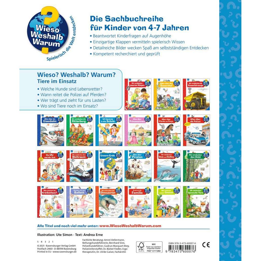 Mit Spürnase, Stärke und Einfühlungsvermögen stehen Tiere uns Menschen jeden Tag zur Seite. Ochse, Esel und Dromedar tragen und ziehen für uns Lasten, während Hütehunde, Lamas und Gänse aufpassen und beschützen. Mithilfe von Klappen entdecken Kinder, wie Polizeipferde eine Demo begleiten, Rettungshunde Vermisste aufspüren und Therapie-Alpakas beim Heilen helfen. Und sie sind dabei, wenn Tier und Mensch für diese Aufgaben gemeinsam trainieren. Wieso? Weshalb? Warum? Die Sachbuchreihe für Kinder von 4–7 Jahren Jeden Tag entdecken Kinder etwas Neues – da kommen viele Fragen auf. Warum sind die Dinosaurier ausgestorben? Wo ist die Sonne in der Nacht? Wozu brauchen wir das Blut? Die beliebte Sachbuchreihe Wieso? Weshalb? Warum? gibt Kindern Antworten auf Augenhöhe. Dabei werden die unterschiedlichsten Themen aus der Alltags- und Interessenswelt der Kinder altersgerecht und mit viel Liebe zum Detail unter die Lupe genommen. Detailreiche Bilder, verständliche Sachtexte und überraschende Klappen, die Bewegungen oder Abläufe veranschaulichen und hinter die Dinge blicken lassen, ermöglichen Kindern, sich ihre Themen selbst zu erschließen. Der Spaß am eigenhändigen Entdecken, die liebevolle Umsetzung und die qualitativ hochwertige Ausstattung garantieren langanhaltende Freude an jedem einzelnen Buch.