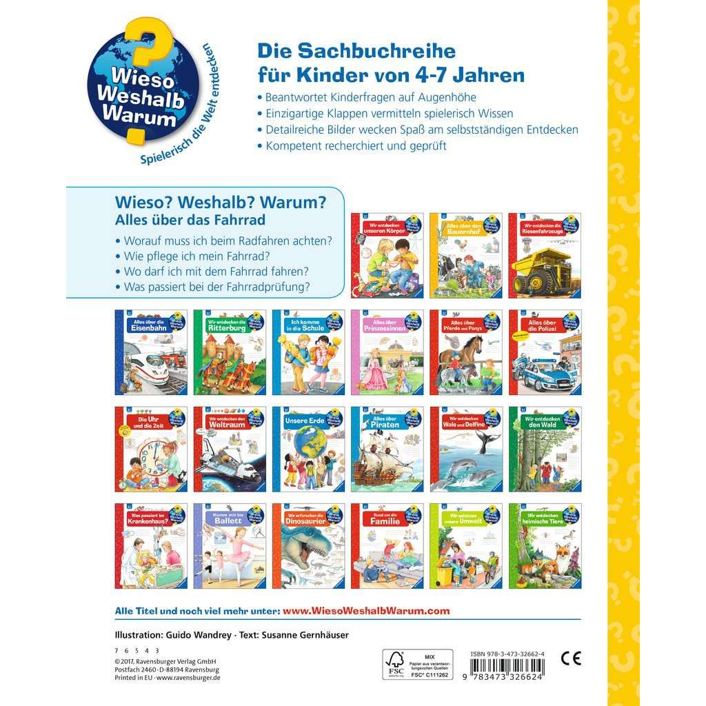 Hier dreht sich alles um den Drahtesel: Angefangen beim Kauf des ersten Fahrrads über die richtige Ausstattung, wichtige Verkehrsegeln und besondere Ausrüstung. Welche Teile gehören zu einem Fahrrad? Wie pflege ich es richtig? Wo darf ich mit dem Rad fahren, und wieso brauche ich einen Helm? Zahlreiche Klappen, detailreiche Bilder und kurze Sachtexte vermitteln spielerisch und anschaulich die wichtigsten Fakten rund ums Rad. Ob ein Ausflug mit Mama und Papa oder der Weg zum Kindergarten: Fahrradfahren macht Spaß, ist gesund und gut für die Umwelt! Wieso? Weshalb? Warum? Die Sachbuchreihe für Kinder von 4–7 Jahren Jeden Tag entdecken Kinder etwas Neues – da kommen viele Fragen auf. Warum sind die Dinosaurier ausgestorben? Wo ist die Sonne in der Nacht? Wozu brauchen wir das Blut? Die beliebte Sachbuchreihe Wieso? Weshalb? Warum? gibt Kindern Antworten auf Augenhöhe. Dabei werden die unterschiedlichsten Themen aus der Alltags- und Interessenswelt der Kinder altersgerecht und mit viel Liebe zum Detail unter die Lupe genommen. Detailreiche Bilder, verständliche Sachtexte und überraschende Klappen, die Bewegungen oder Abläufe veranschaulichen und hinter die Dinge blicken lassen, ermöglichen Kindern, sich ihre Themen selbst zu erschließen. Der Spaß am eigenhändigen Entdecken, die liebevolle Umsetzung und die qualitativ hochwertige Ausstattung garantieren langanhaltende Freude an jedem einzelnen Buch.