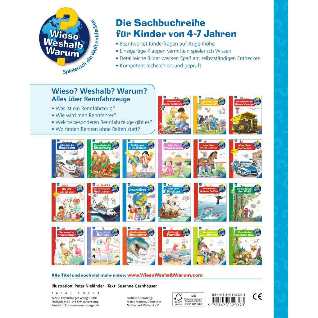 Ob Formel-1-Wagen, Motorrad oder Powerboot: Rennfahrzeuge sind faszinierend! Das Buch stellt verschiedenste Gefährte vor und zeigt anhand detaillierter Bilder und Klappen, was unter den Motorhauben schlummert. Auch die Sicherheit der Fahrer, ihre Ausrüstung und das Training werden thematisiert. Neben Fahrzeugen mit vier oder zwei Reifen werden auch Motorboote und Rennflugzeuge gezeigt. Und beim Kartfahren können schon Kinder den Einstieg in den Motorsport finden. Auf der letzten Seite lädt eine ausklappbare Rennstrecke dazu ein, selbst zum Rennfahrer zu werden und um den Sieg zu wetteifern! Wieso? Weshalb? Warum? Die Sachbuchreihe für Kinder von 4–7 Jahren Jeden Tag entdecken Kinder etwas Neues – da kommen viele Fragen auf. Warum sind die Dinosaurier ausgestorben? Wo ist die Sonne in der Nacht? Wozu brauchen wir das Blut? Die beliebte Sachbuchreihe Wieso? Weshalb? Warum? gibt Kindern Antworten auf Augenhöhe. Dabei werden die unterschiedlichsten Themen aus der Alltags- und Interessenswelt der Kinder altersgerecht und mit viel Liebe zum Detail unter die Lupe genommen. Detailreiche Bilder, verständliche Sachtexte und überraschende Klappen, die Bewegungen oder Abläufe veranschaulichen und hinter die Dinge blicken lassen, ermöglichen Kindern, sich ihre Themen selbst zu erschließen. Der Spaß am eigenhändigen Entdecken, die liebevolle Umsetzung und die qualitativ hochwertige Ausstattung garantieren langanhaltende Freude an jedem einzelnen Buch.