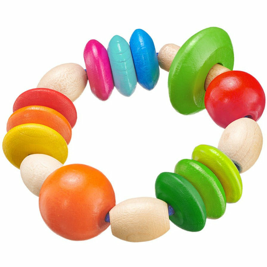 Spielerisch tasten und fühlen. Der bunte Rassel-Greifling mit Klapperring aus Massivholz.