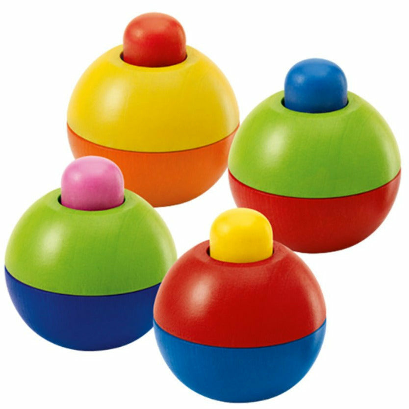 Wie von Zauberhand kehrt die quirlig kullernde Holzkugel immer wieder in die aufrechte Position zurück. Wer oben auf den Stöpsel drückt, wird mit einem lustigen Quietschen belohnt. Spannender Kugelspaß – zum Hören und Staunen!