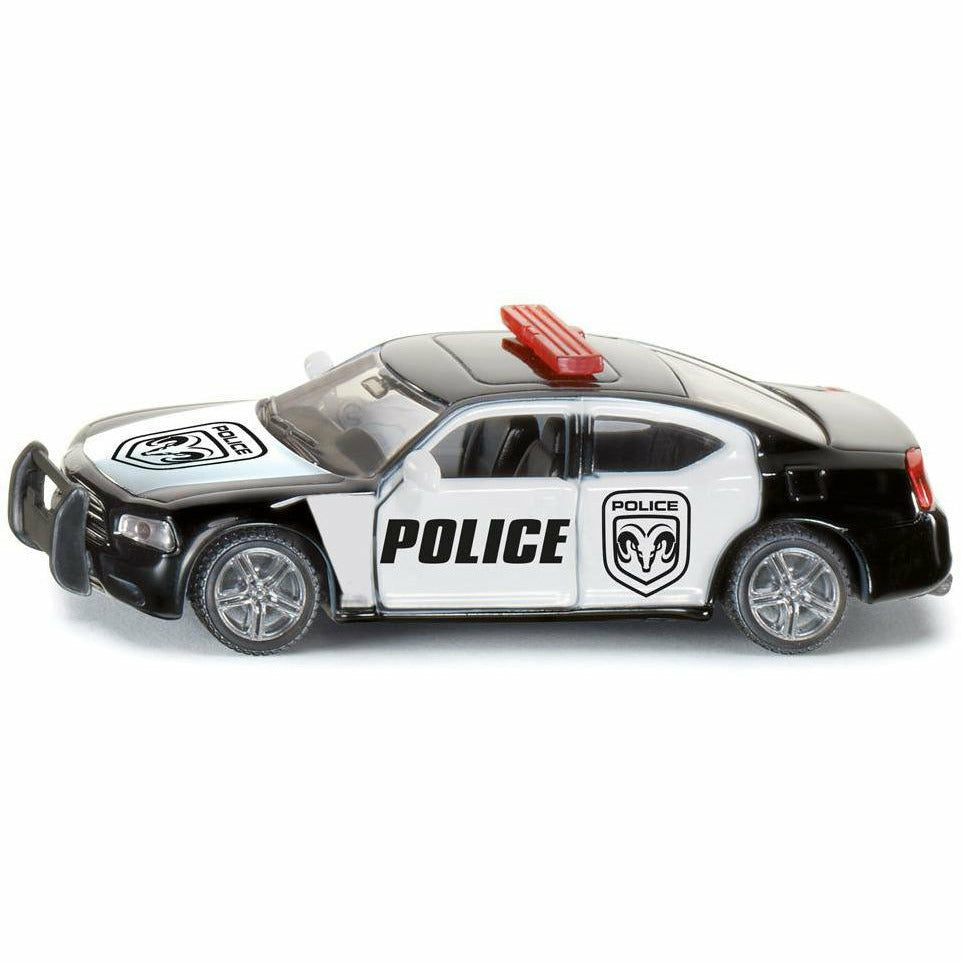 Auf Basis des Dodge Charger gestalteter Streifenwagen der US-Polizei mit rotem Signalbalken und Rammbügel an der Vorderseite. Reifen aus griffigem Kunststoffmaterial auf Sportfelgen. Karosserie mit zu öffnenden Türen aus Metall.