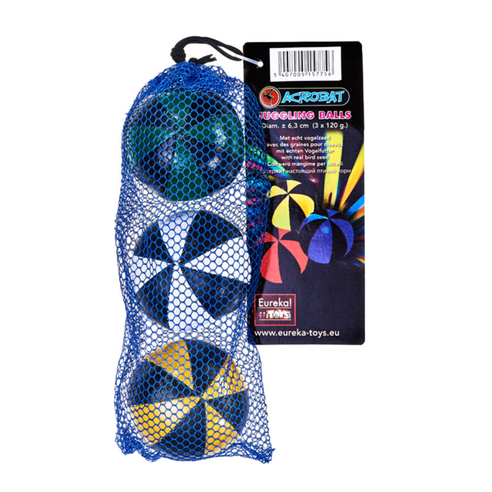 Das Set besteht aus 3 zweifarbigen gemischten Jonglierbällen, speziell für größere Jongleure (14+ Jahren). Diese mit PVC ummantelten Bälle sind mit Vogelfutter befüllt und wurden von Hand genäht. Sie werden in einer praktischen Netztasche zur Aufbewahrung geliefert. Eine kurze Anweisung in Englisch, Französisch, Deutsch, Italienisch und Niederländisch ist enthalten.