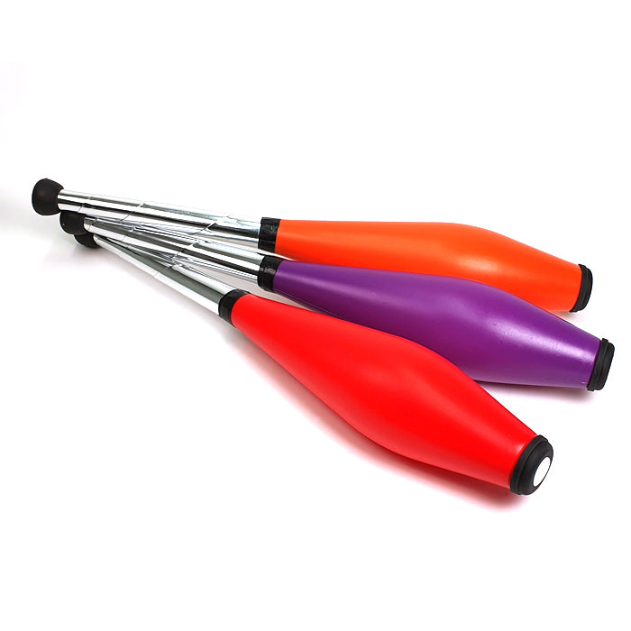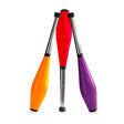 3er Jonglierkeulen Set mit silber gewickeltem Griff in den Farben Rot, Lila und Orange.