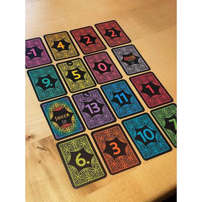 - Mit der -2, die die niedrigste Karte ist und nur 4x im Spiel vorkommt, muss man - wenn man sie abwirft - die verdeckten Karten einer ganzen Reihe oder Spalte (also maximal 4) geheim ansehen. Dazu muss man eine beliebige verdeckte Karte aufdecken.