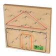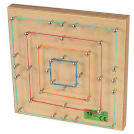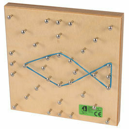 Das Spannbrett aus Buchenholz ist mit Metallstiften bestückt und erlaubt das kreative Gestalten vielfältiger Muster und Bilder. Angefangen von einfachen geometrischen Formen, wie bei einer Geotafel oder einem Geobrett, sind darüber hinaus auch komplexe Motive durch die spezielle Anordnung der Stifte möglich.