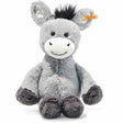 Der 30 cm große Dinkie Esel ist aus kuschelweichem graublauen Plüsch. Die Nase und die Innenohren sind in Weiß abgesetzt. Das niedliche Gesicht zieren aufwendige gestickte Nasenlöcher sowie die lächelnde Mundlinie. Ein schwarzer Haarflaum auf dem Kopf lässt ihn noch entzückender und possierlicher aussehen. Die dunkelgrauen Pfoten sind mit Granulatsäckchen gefüllt. Ein niedlicher Freund für kleine Kinder.