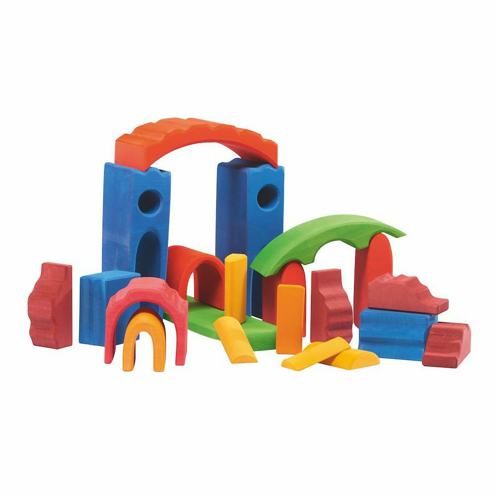 Bunt, kreativ, fantasievoll. Die Formen sind aus hochwertigem Lindenholz hergestellt und ergeben eine besondere Haptik durch die gebeizten Oberflächen. Freie Bauweisen in allen möglichen Traumwelten lassen Kinder und Eltern zu individuellen Baumeistern werden.
