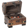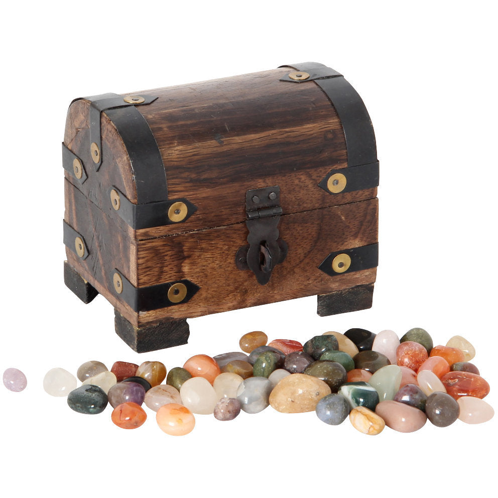 Rustikale Schatztruhe aus Mangobaumholz mit dunklen Metallbeschlägen und messingfarbenen Nieten. Gefüllt ist die Truhe mit Trommelsteinen aus vielen verschiedenen Mineralien und Halbedelsteinen wie Achat, Amazonit, Amethyst, Aventurin, Bergkristall, Carneol, Japsis, Rosenquarz Sodalith oder Tigerauge.