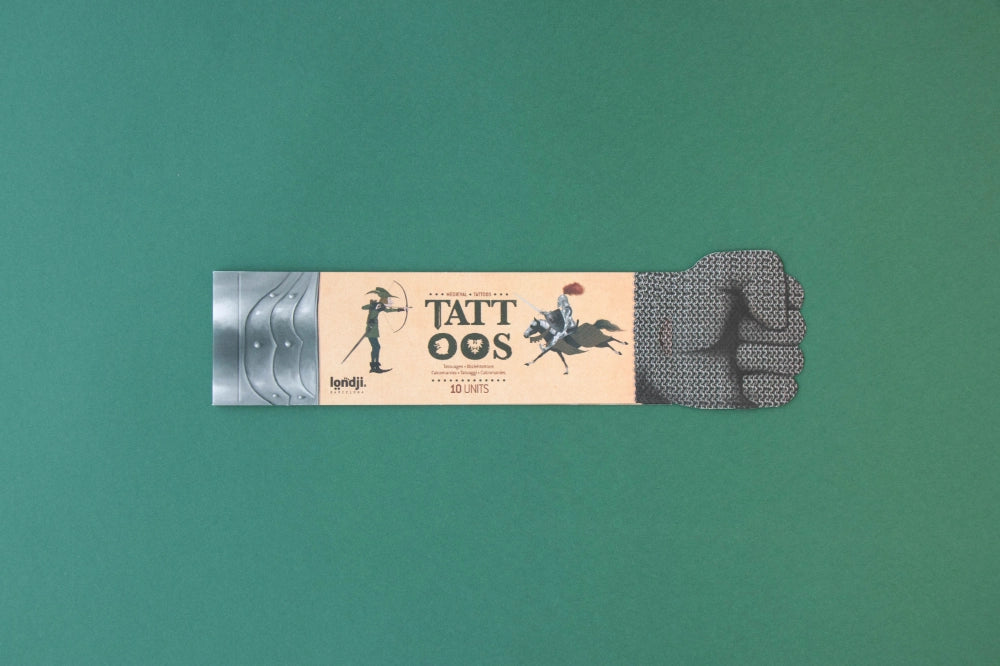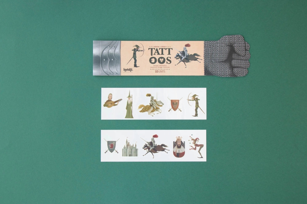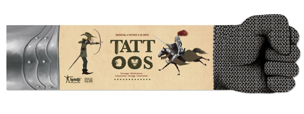 Ritter von Londjis Königreich, wir sind stolz darauf, unsere fantastischen mittelalterlichen Tattoos zu präsentieren! Sie sind sicher, ungiftig, macht Spaß und werden in Europa hergestellt. Das Turnier kann jetzt beginnen! Schmücke deinen Körper und vervollständige deine Kostüme mit diesen zehn hochwertigen temporären Tattoos von mittelalterlichen Rittern und Figuren. Dermatologisch getestet.